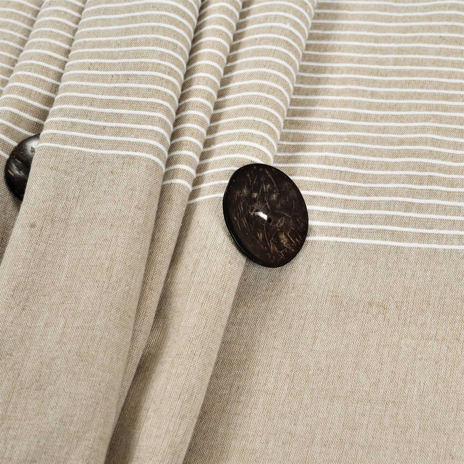 This linen shower curtain adds charming farmhouse style to any master bathroom, guest bathroom, or teenagers bathroom. The trendy, decorative button embellishments and striped pattern in the top section add a unique touch to the look of your space. This rustic shower curtain has a neutral color that will tie together any style of decor. Because these fabric curtains are made of 100% cotton, they are extremely durable and can even be cleaned. Hang the shower curtain to air dry to maintain the look and feel of these luxurious curtains. Use only non-chlorine bleach as needed. Plus, linen fabrics breathe well and dry quickly. Each curtain measures 72″ H x 72″ W, so theyre wide and tall enough for a standard shower or bathtub. The beige color blends into your space without being overwhelming. The color and design of this cloth shower curtain can coordinate with any rustic bathroom design style from farmhouse to country. The elegant cloth curtain features a row of small holes at the top to accommodate your shower rings or hooks. All of our products are made by a team of in-house designers who aim to create items that are functional, fashionable, and unique.