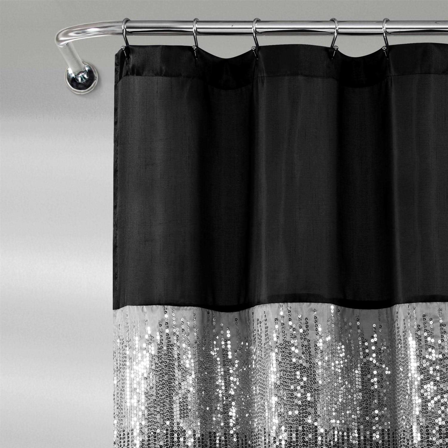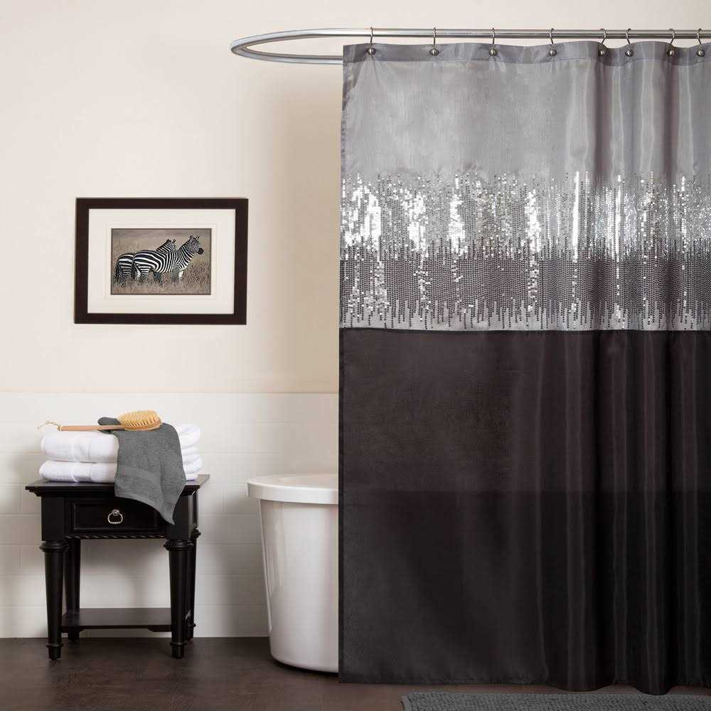 • Bold fabric shower curtain with a shimmery, sequin panel for an eye-catching design.