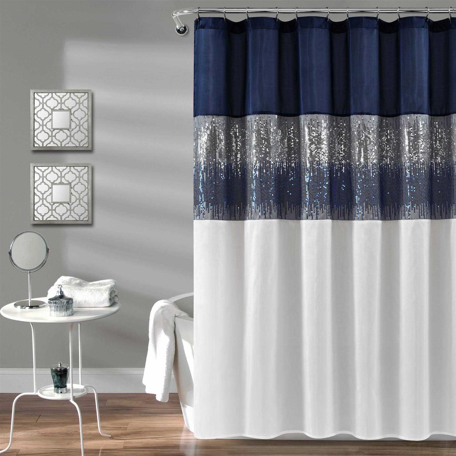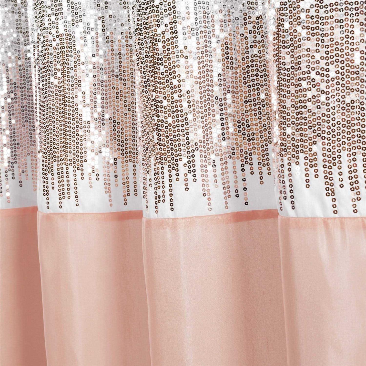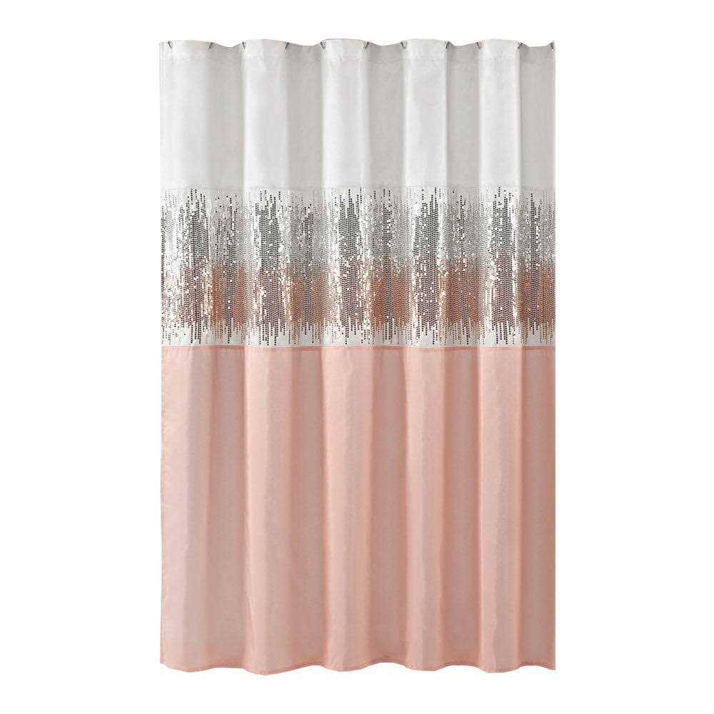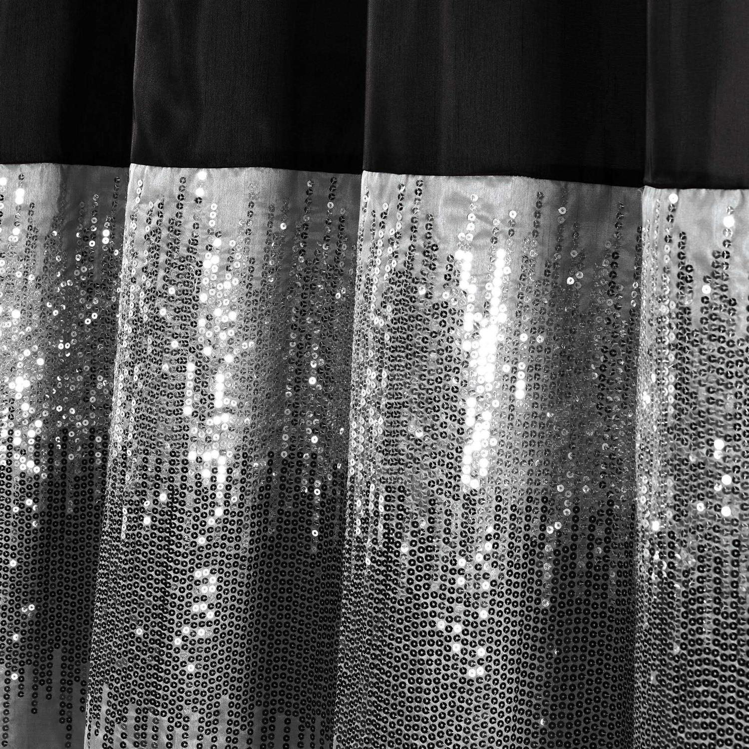 - Bold fabric shower curtain with a shimmery, sequin panel for an eye-catching design.