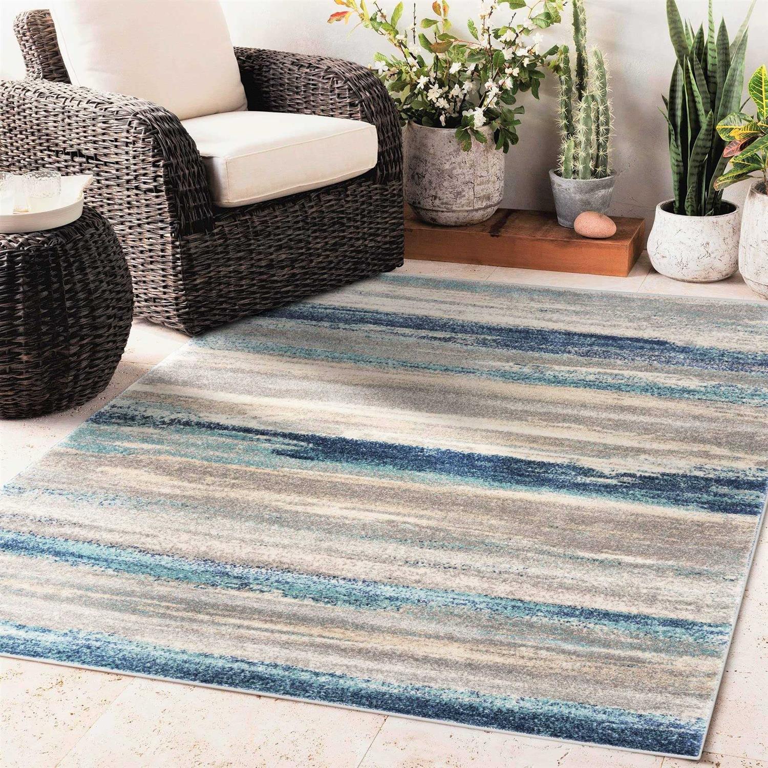 Luxe Weavers Abstract Stripe Area Rug is a machine-woven rug with stain-resistant properties. Modern rugs that give your feet a comfortable walking surface. The abstract print comes in neutral gray, sandy hues, coastal blues, or rich oranges. 2×3, 2×7 runners, and 4×5 area rugs fit in cozy spaces or hallways. Adding a 5×7 or 6×9 accent rug separates a living area from dining rooms in an open floor plan. Artistic rugs complement coastal and contemporary home décor styles. Easy to clean rugs in 8×10 or 9×12 rug sizes are suitable for living rooms or other high traffic areas in the home. This transitional accent rug has a half-inch pile height and soft fibers to add comfort with each step. Make your house feel more like a home with a long-lasting Luxe Weavers rug. Size: 3′ 9″ x 5′ 2″.