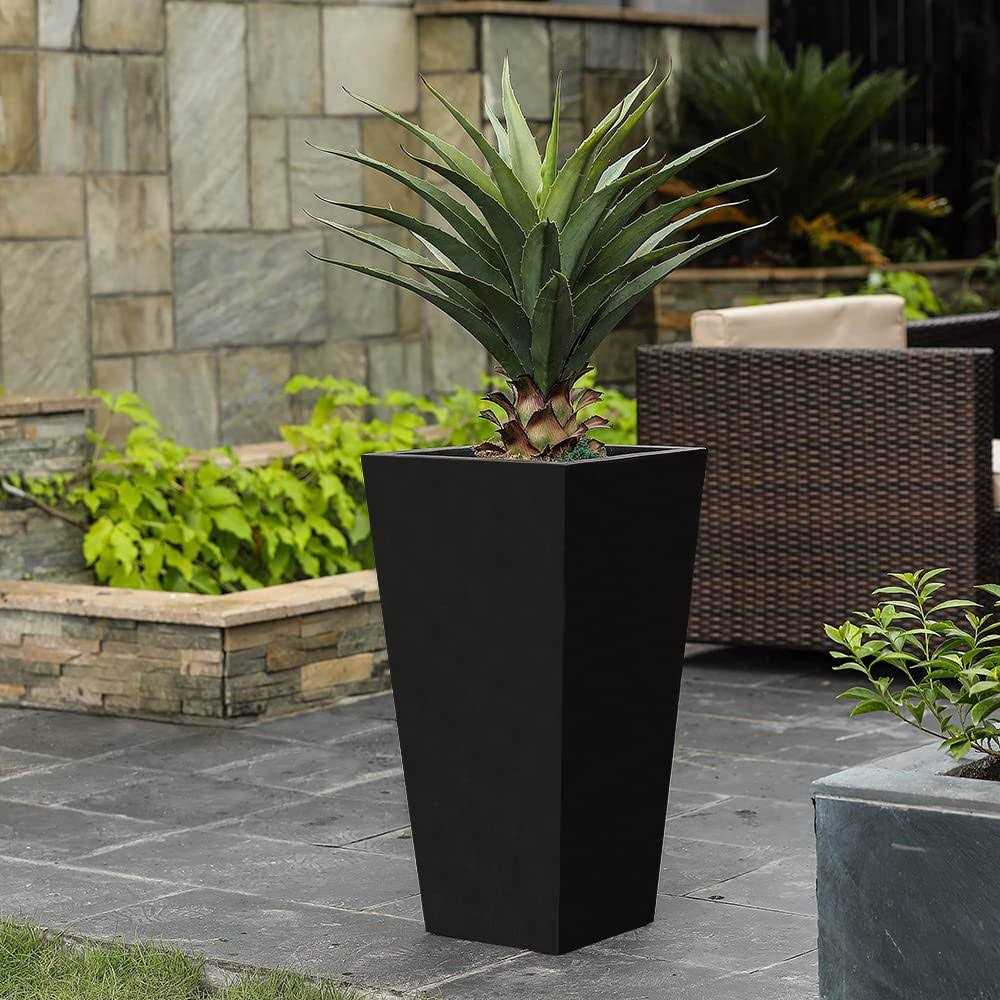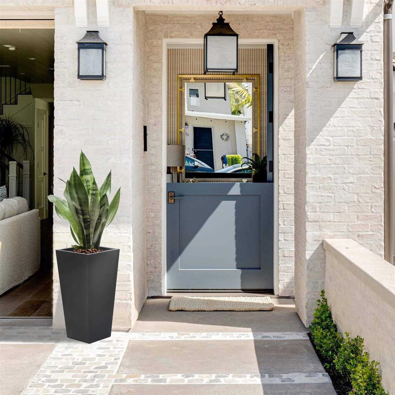 This tall and distinctive planter is the perfect addition to any front entrance. This design showcases a modern, sleek square tapered design, finished in a stunning black perfect for the modern home. Designed to live outdoors, it is crafted from weather-resistant magnesium oxide that does not mind UV light beaming down or rainstorms rolling through, and this planter is durable and designed for all seasons. The planter includes a drainage hole so you can avoid over watering your plant. It also includes a drainage plug, so you can place it indoors to freshen up your home as well! Whether on your porch, in your sun room or entryway, this planter is the perfect complement to your style!