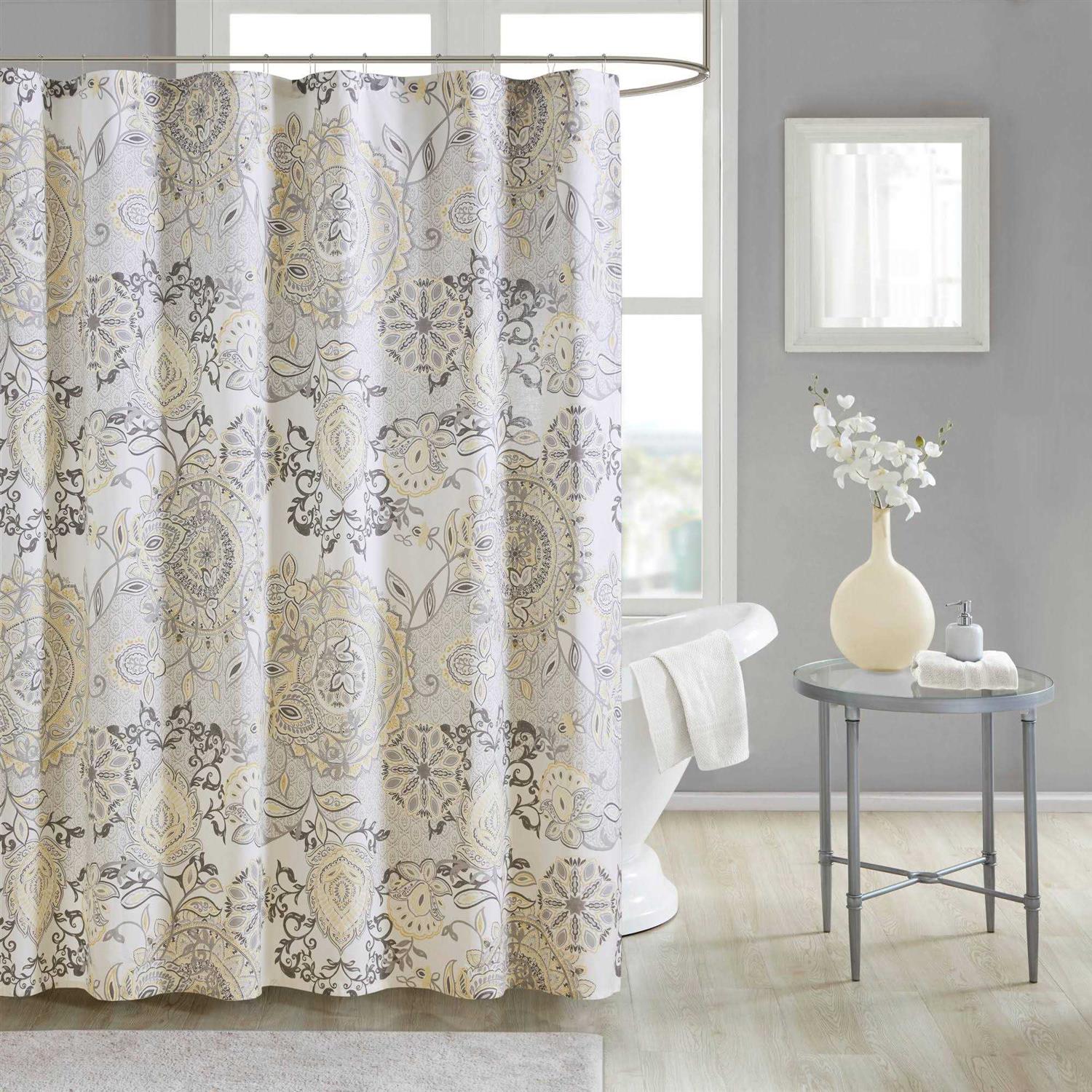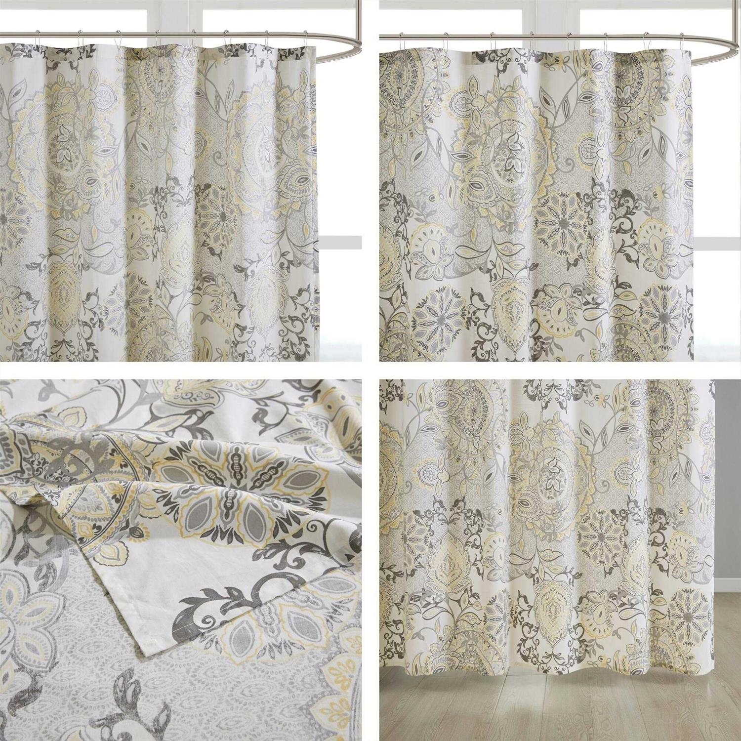 Refresh your bathroom with our Madison Park Isla shower curtain. This printed shower curtain flaunts a beautiful floral and medallion motif in soft yellow and black watercolor hues. While the 100% cotton percale base adds natural appeal for an organic touch to any decor. Machine washable for easy care, this shower curtain is also OEKO-TEX certified meaning it does not contain any harmful substances or chemicals, for the best in quality comfort and wellness. Each shower curtain measure 72″x72″ and is finished with 12 button holes at the top making it easy to hang; hooks, rod, and a water repellant liner are not included and will need to be purchased separately. Complete the look with coordinating bedding, available and sold separately.