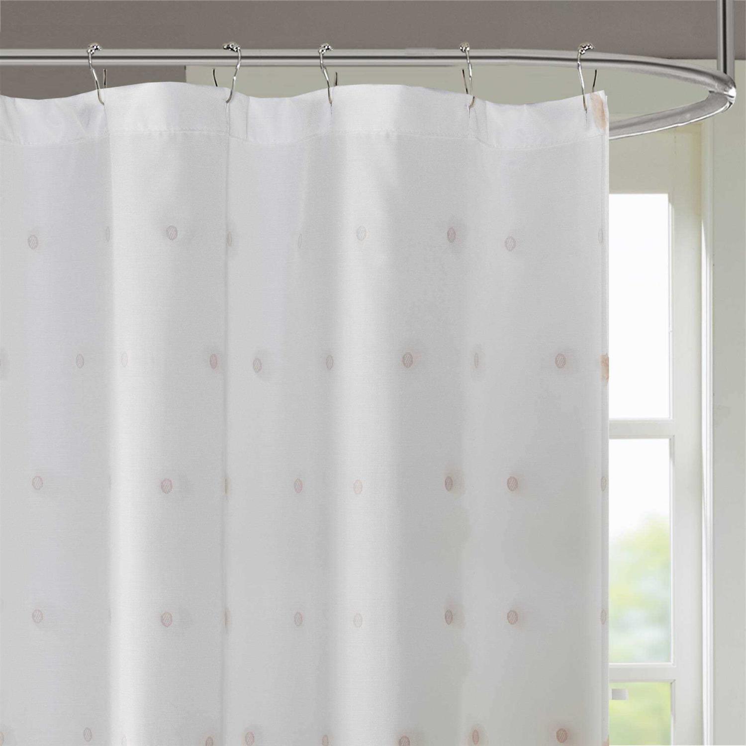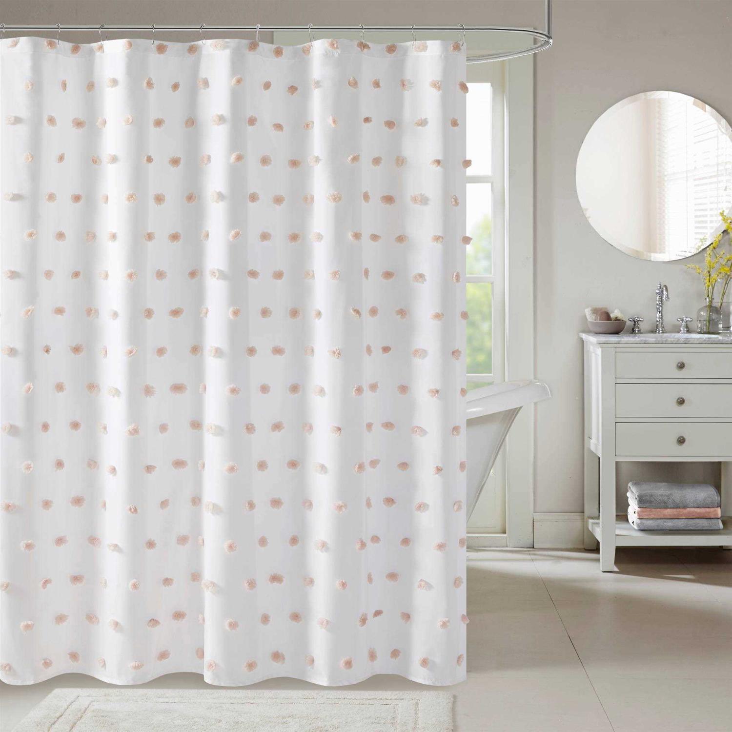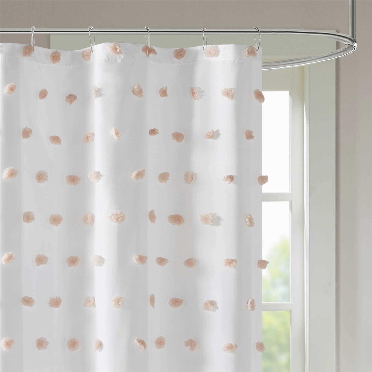 Add a fun update to your space with the Madison Park Sophie shower curtain. The solid white background features rows of soft blush fabric pom poms, adding beautiful texture and a stylish update to any bathroom. Machine Washable for easy care; Each shower curtain measure 72 inchx72 inch and is finished with 12 button holes at the top making it easy to hang; hooks, rod, and a water repellant liner are not included and will need to be purchased separately.