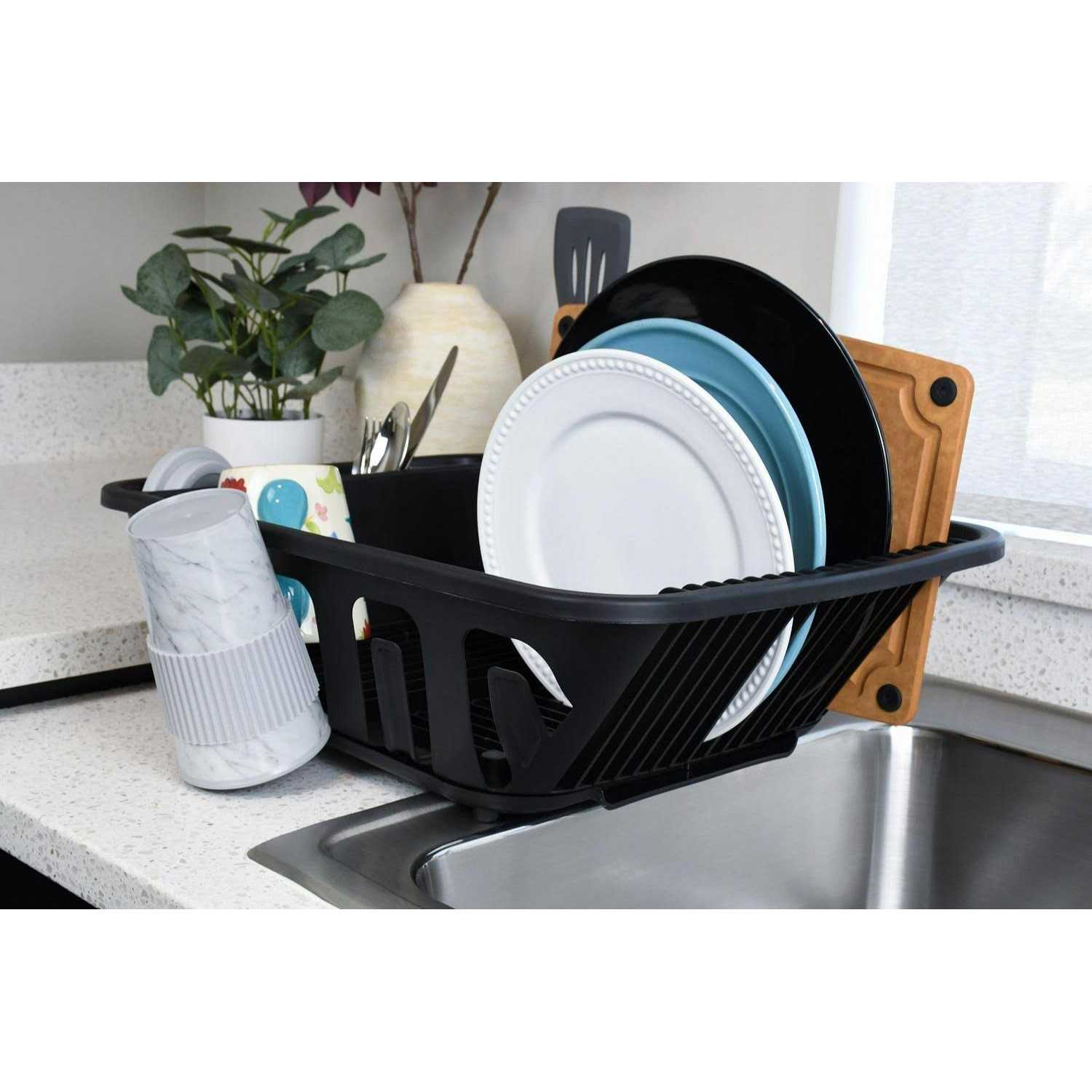 Mainstays 2 Piece Plastic Kitchen Sink Set, Dish Rack with Slide-Out Drip Tray, Black