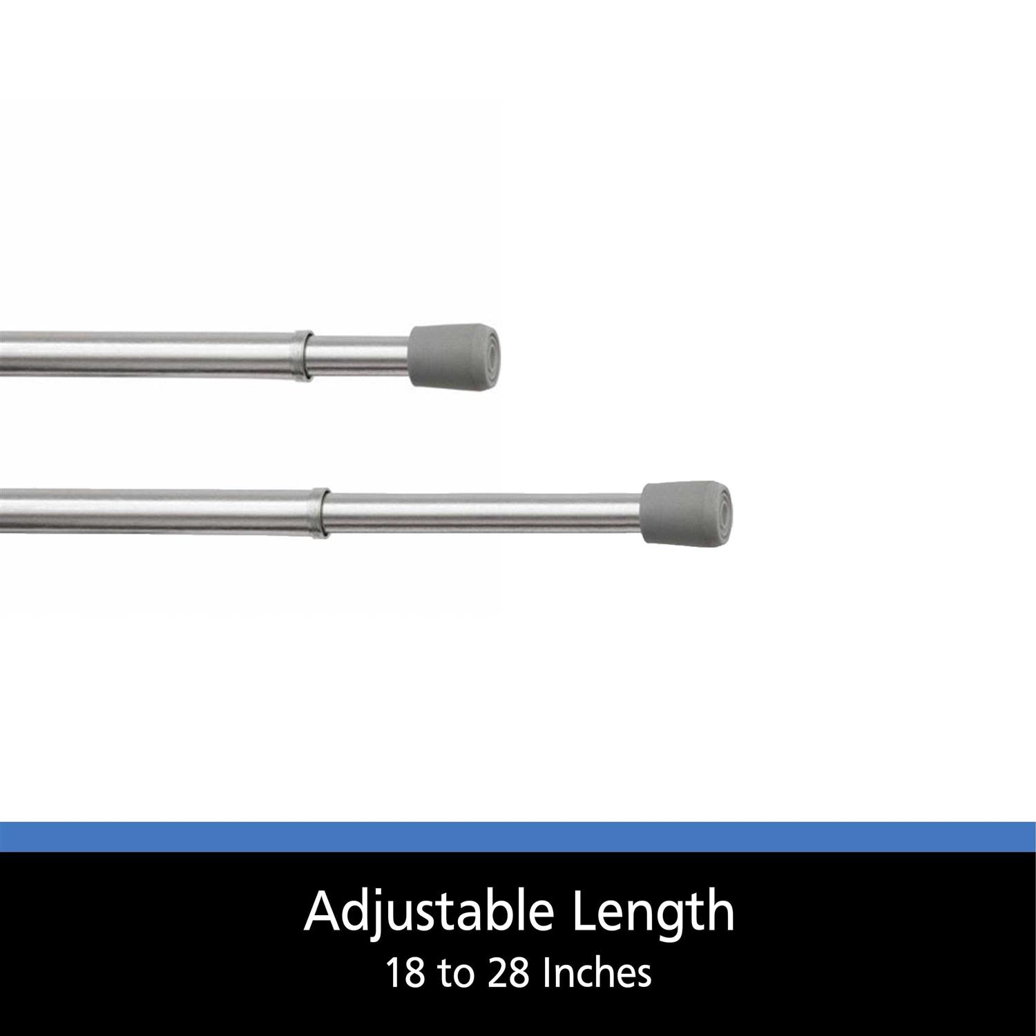 It makes it easy to hang drapes, curtains and more. Its length can be adjusted between 18″ and 28″ to better suit different areas. This hanging rod has a sleek chrome finish. This chrome-finished tension rod supports its own weight, making it easy to install without the need for any tools. 7/16″ in diameter.