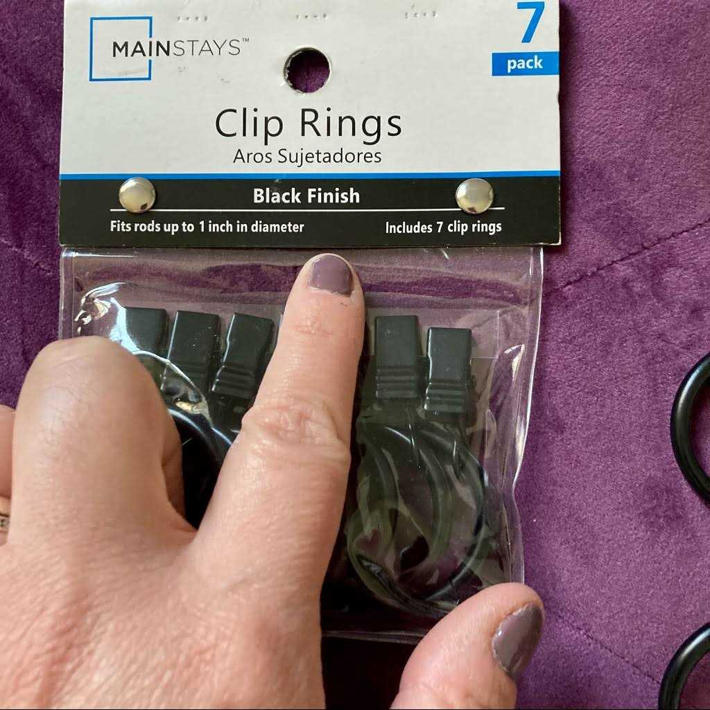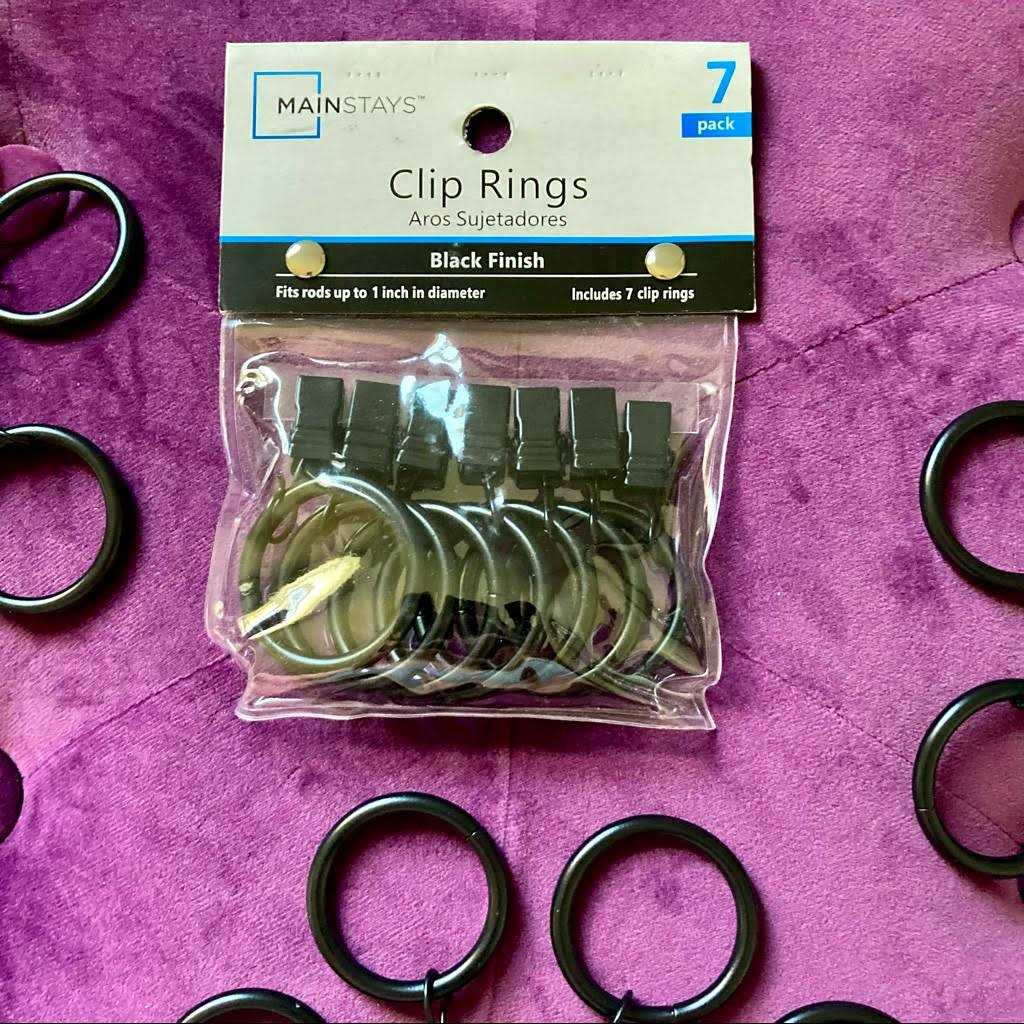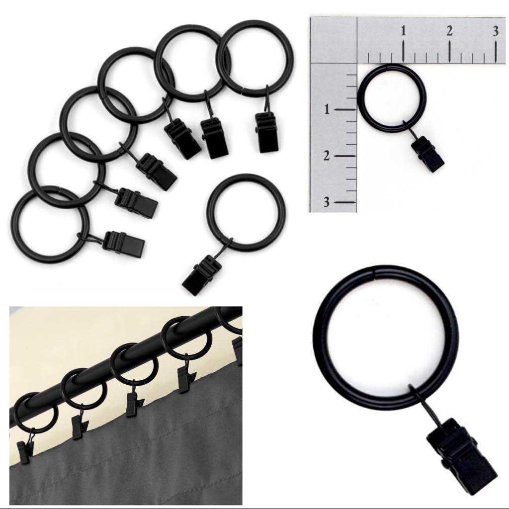 These simplistic Mainstays Curtain Clip Rings in a black finish are perfect for enhancing the look of your drapery rods in your home. Simply clip the rings to your curtain or drapes, making sure to leave an even amount of space between each clip. Then place the rings now attached to the curtain or drapes on your new or existing curtain rod. The clip rings will make it easy to move the drapes to an open or closed position. Pair with new dcor that are shades of nickel, black, grays and whites. This set of seven curtain clip rings is the perfect addition to bedrooms, living rooms, dining rooms and the office. Complete the look with coordinating single or double rods (sold separately). The clip rings are made of metal to effectively hold your curtains or drapes. Included with this set are seven clip rings. Clean/dust with a slightly damp or dry cloth.