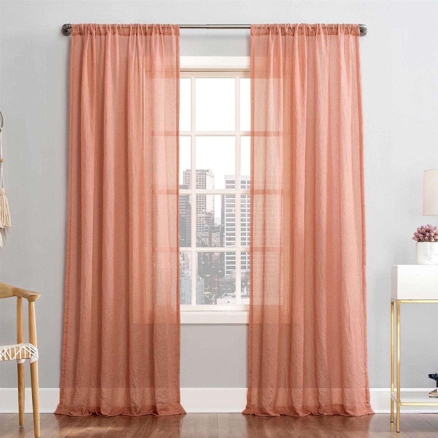 The Mainstays Linen Textured Curtain Panel in terracotta is soft to the touch and adds a breezy relaxed look to any decor setting. This casual solid lets light gently filter through. Clean, simple one-pocket pole top design can be used with a standard or decorative curtain rod. Sold as individual panels measuring 50 inch width by 84 inch length. Measure carefully before selecting your desired size and quantity. Machine wash cold on gentle cycle. Use non-chlorine bleach when needed. Tumble dry on low heat.