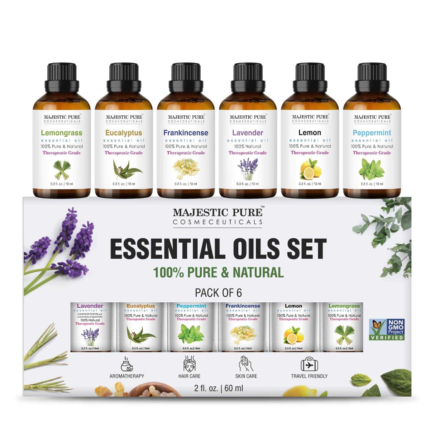 Essential Oils Set – Frankincense, Peppermint, Lavender, Eucalyptus, Tea Tree, Lemongrass 10ml x 6 by Majestic Pure