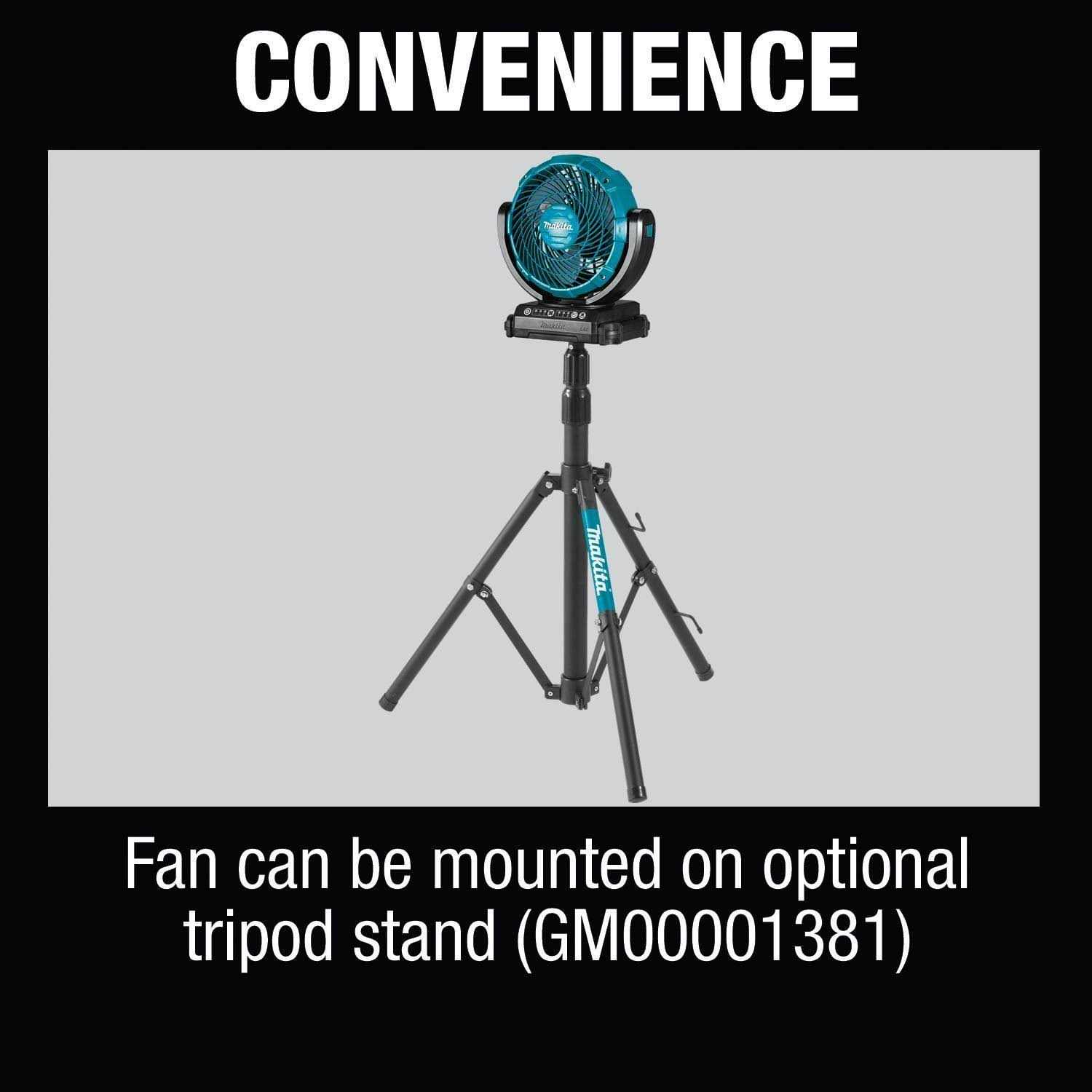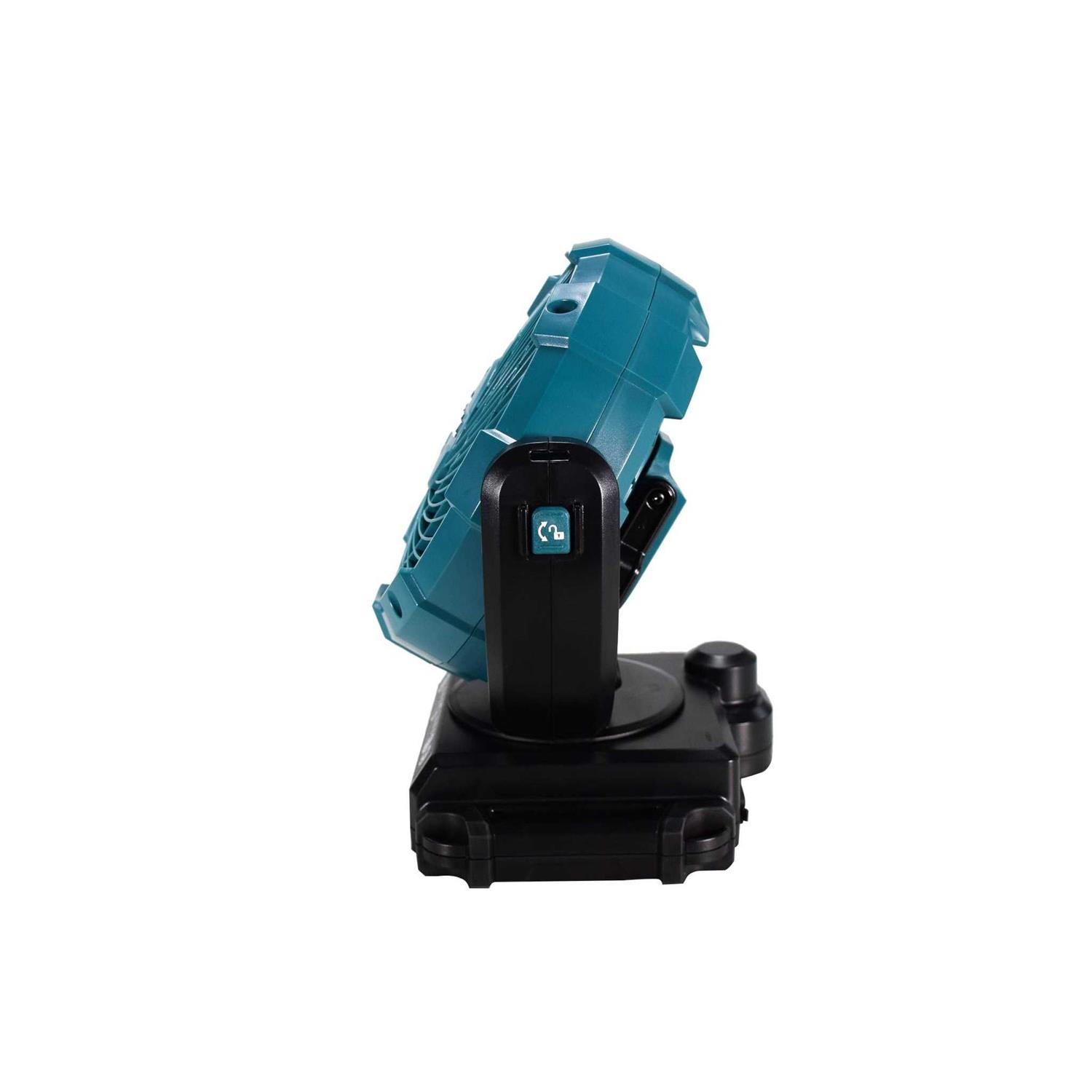 The Makita 18V max LXT Lithium-Ion Cordless 7-1/8 Fan is a portable and convenient air-moving solution for painters contractors and more. The fan has three speed settings and an oscillation selector for optimal air velocity and control. When using an 18V LXT 5.0Ah battery BL1850B sold separately users get up to 8.2 hours of continuous run time on the high speed setting 12 hours on medium speed and up to 17.5 hours on the low speed setting. Added features include tilt-settings for better direction of air flow and an adjustable hook for easy handling and hanging. The 3-stage automatic timer has 1-hour 2-hour and 4-hour power-off selection. The fan is compatible with 18V LXT batteries including 2.0Ah 3.0Ah 4.0Ah 5.0Ah and 6.0Ah batteries sold separately. It s part of Makita s expanding 18V Lithium-Ion system the world s largest cordless tool system powered by 18V Lithium-Ion slide-style batteries. Makita 18V Lithium-Ion batteries have the fastest charge times in their categories so they spend more time working and less time sitting on the charger.