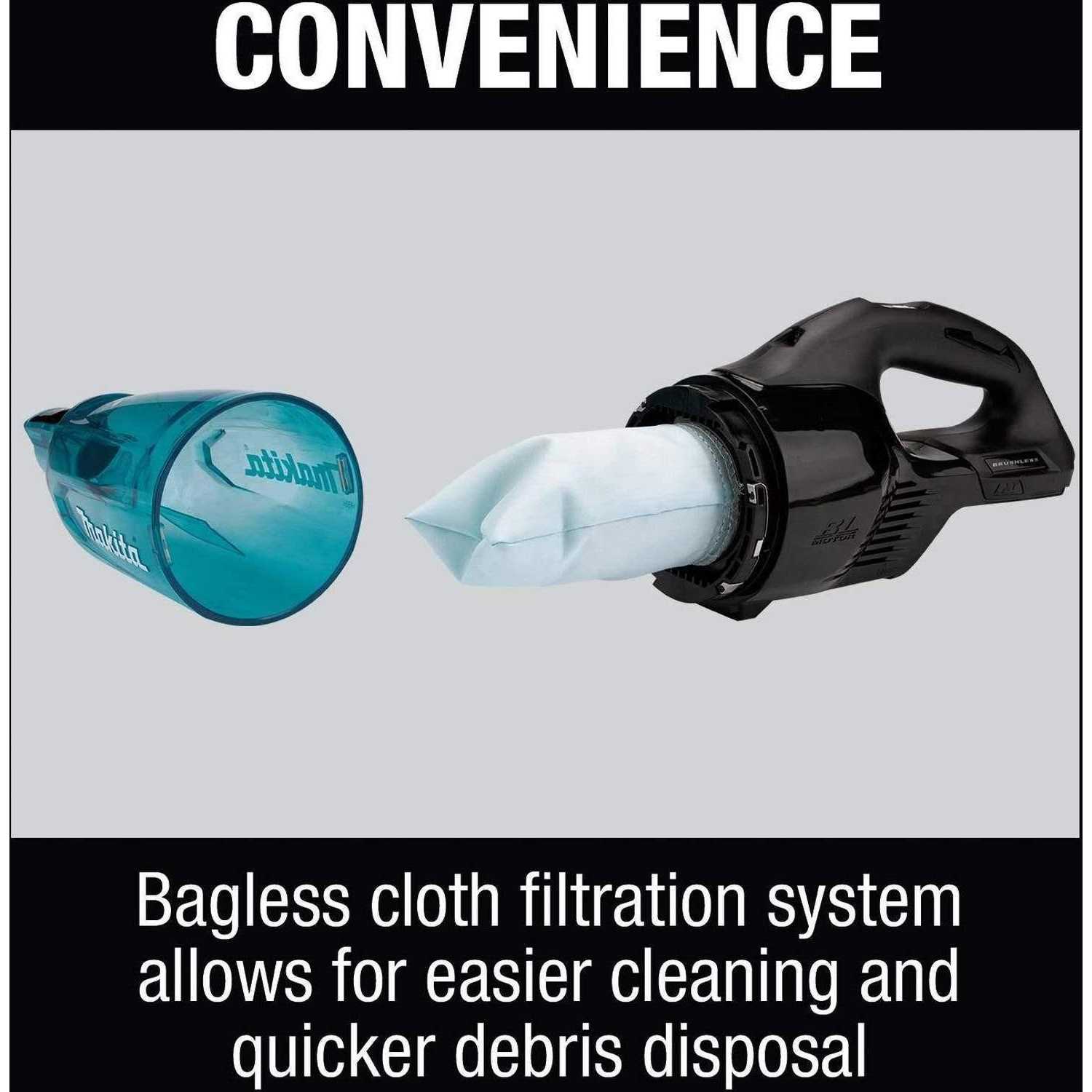 The Makita 18V LXT Brushless Cordless Vacuum (XLC04ZBX4, tool only) is a compact and powerful cordless vacuum with strong suction for fast and efficient cleaning. The Makita 18V brushless stick vacuum has a push button power selection for operation. Compact and ergonomic design for operator comfort and, at 2.7 lbs., is lightweight for reduced operator fatigue. A bagless cloth filtration system allows for easier cleaning and quicker debris disposal. Get up to 83 minutes of continuous use from a single fully charged 18V 5.0Ah LXT battery (sold separately). The powerful Makita-built motor delivers up to 53 CFM. The vacuum and included nozzle and attachment feature the distinctive teal and black trade dress. Its part of Makitas expanding 18V LXT system, the worlds largest cordless tool system powered by 18V lithium-ion batteries. Makita 18V Lithium-Ion Batteries have the fastest charge times in their categories, so they spend more time working and less time sitting on the charger.