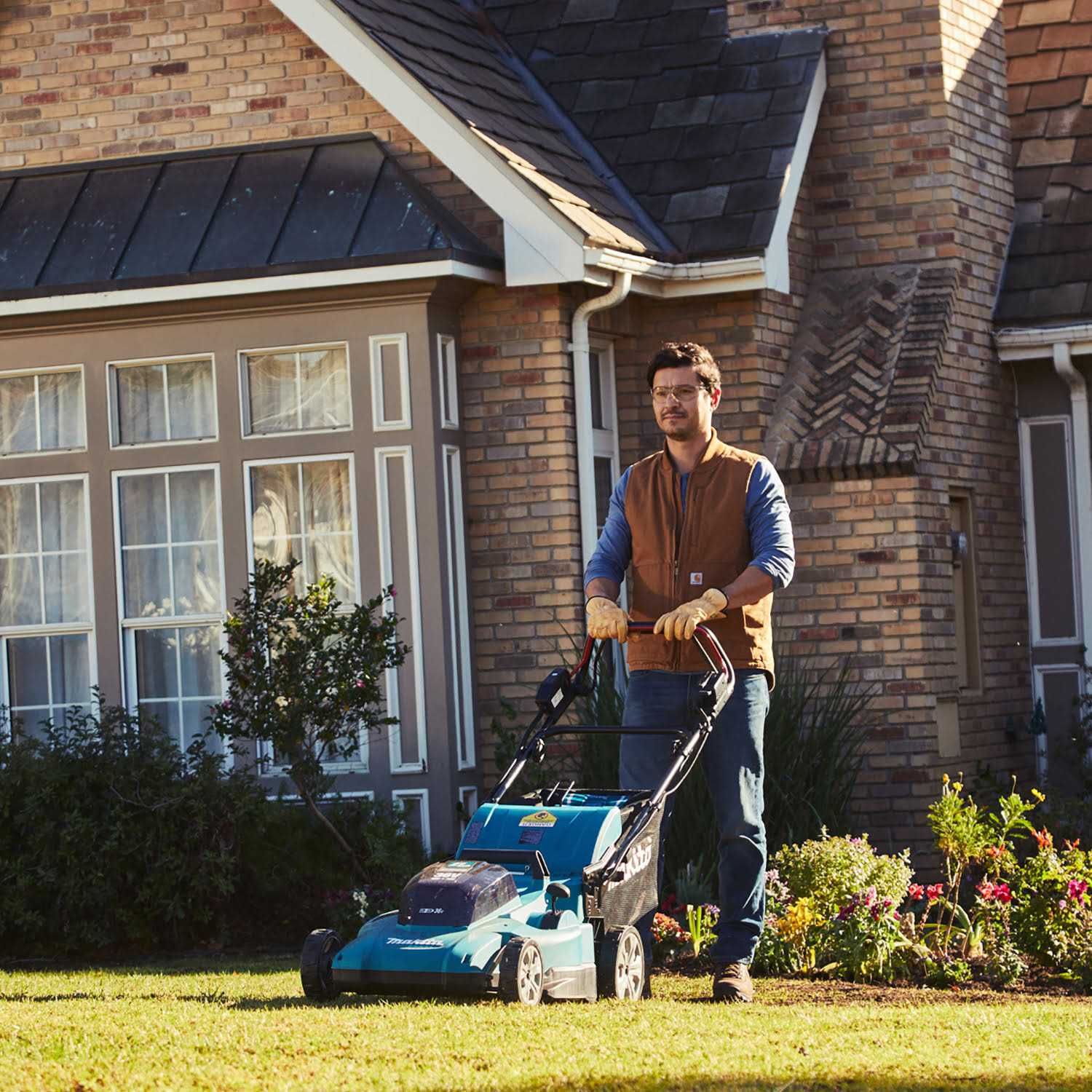 With zero emissions, lower noise and reduced maintenance, the 18V X2 (36V) LXT Cordless Self-Propelled Lawn Mower is a welcome solution for efficient grass cutting. The 4-bay battery system holds 4 batteries for twice the run time, but without leaving the 18V battery platform. The Makita-built motor delivers up to 2,800 RPM. The Quiet Mode setting reduces noise by providing constant speed control at 2,300 RPM. It mows up to 1/2 an acre using 4 5.0Ah 18V LXT Batteries. The mower offers ease-of-use features including quick height adjustments, mulching capability, and a commercial-grade steel deck. It features a 3-in-1 design for mulching, bagging, or side discharge. The XML08PT1 includes the lawn mower, four fast-charging 18V LXT lithium-ion 5.0Ah batteries and an efficient 18V Dual Port Rapid Optimum Charger. The lawn mower features Makita Extreme Protection Technology (XPT). XPT is a protective seal inside the tool and is engineered for improved operation in harsh conditions by channeling water and dust from key internal components.