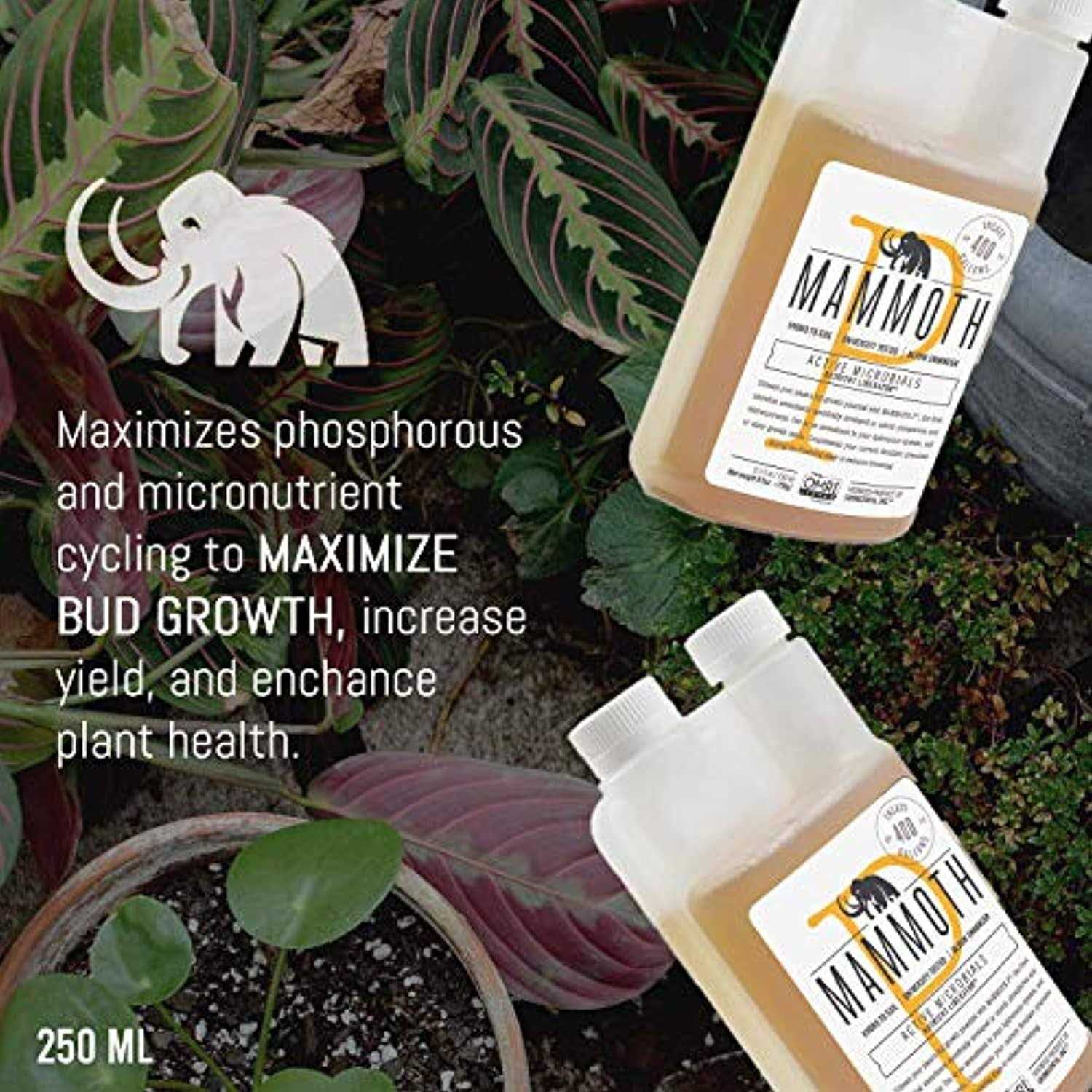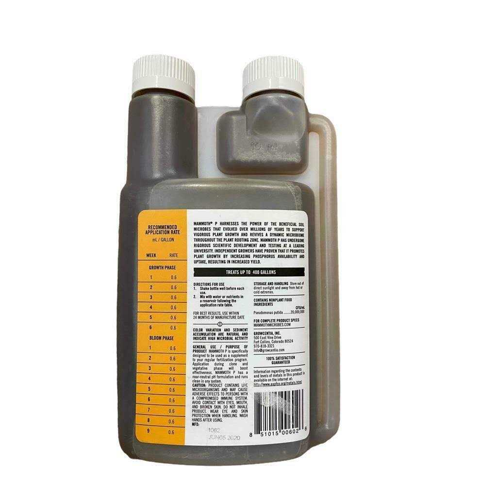 Mammoth P is an organically derived microbial inoculant. It will maximise the phosphorus and micronutrient cycle to increase bud size yield and enhance plant health. Shelf life over 2 years pH operating range is 4 to 9 Temp range is from freezing to 40C can be frozen and re-invigorated. Average yield increase is 16% pier reviewed and sited studies available OMRI certified and 100% organic Now sold in over 1500 stores world wide Won product of the year 2017 in Garden Culture UK magazine survey. Application rate is a tiny 0.16ml per litre making it much cheaper to use than its price suggests. Average return on investment is over 400% – documented by over 100 x Colorado commercial grows. How shoud I Use Mammoth P Mammoth P is already active and concentrated so it is best to apply right before application to the plants. The P microbes like to be in the root zone so the faster that you deliver them to the plant is best. Remember you only need to use 1ml per 8L of mixed up solution due to the high concentration! Tip: Use a pipette to deliver 1ml plus 6 more drops to a 10L bucket of water and nutrient solution.