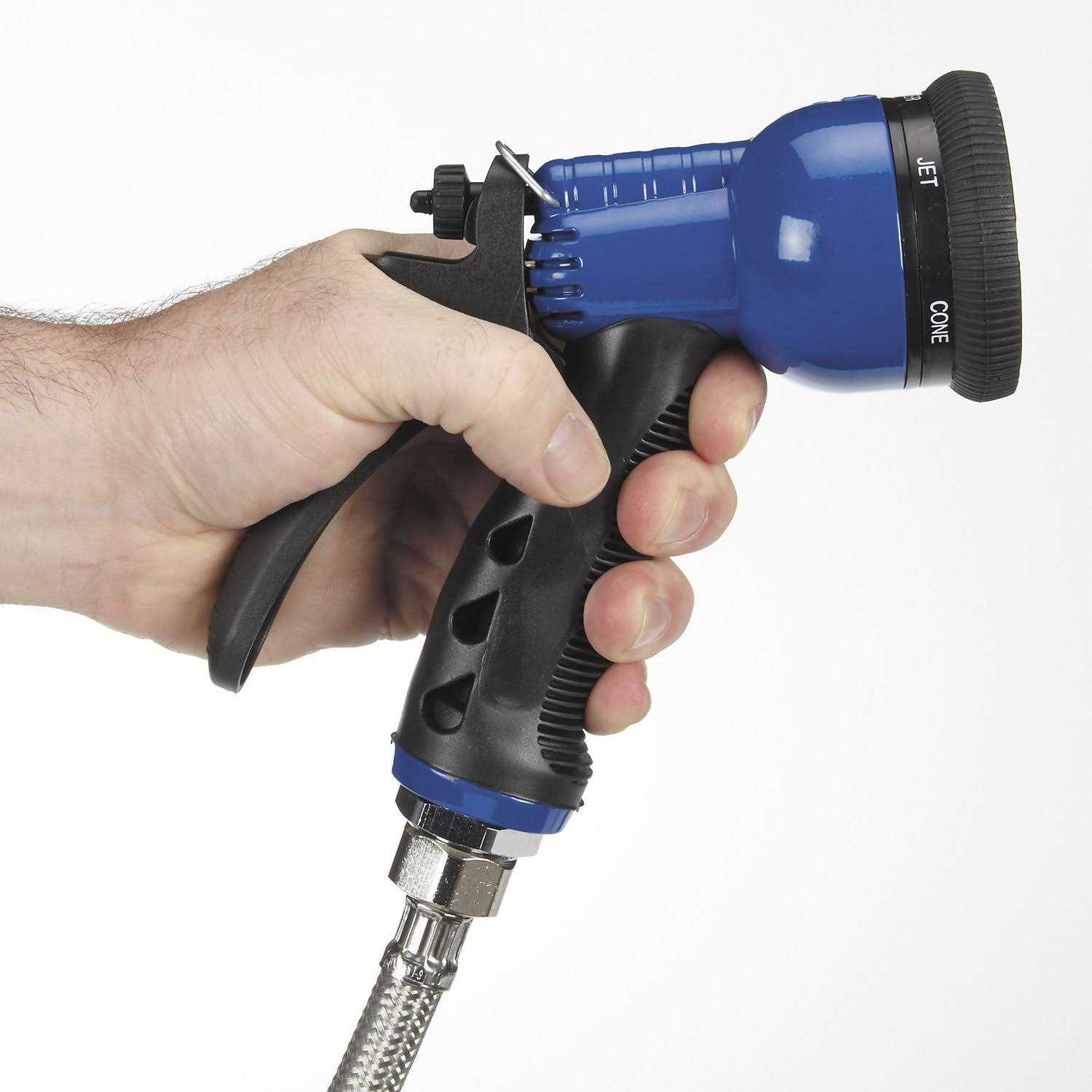 Master Equipment 6 in 1 Stainless Steel Spray Hoses give years of kink free use. Durable professional quality head provides six sure click settings mist shower flat soaker cone and jet. A simple thumb latch makes switching settings quick and easy. Ergonomic grip reduces repetitive motion injury. Connects directly to plumbing pipe. Measures 60 inch L.