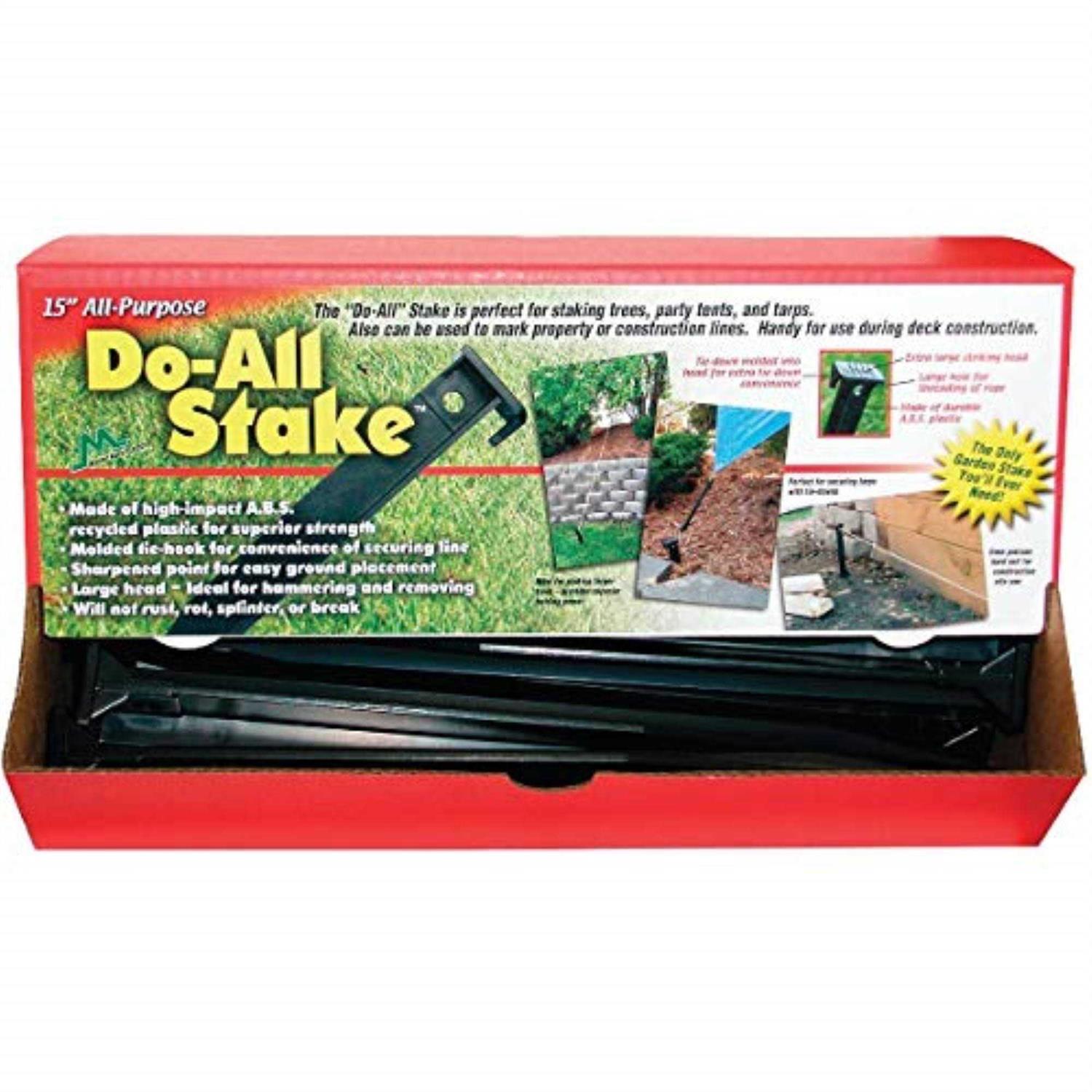 Do-All stakes, ideal for staking trees, party tents, and tarps. Durable, features a large head for easy pounding and removal. Stakes will not rust, rot, splinter, or break.