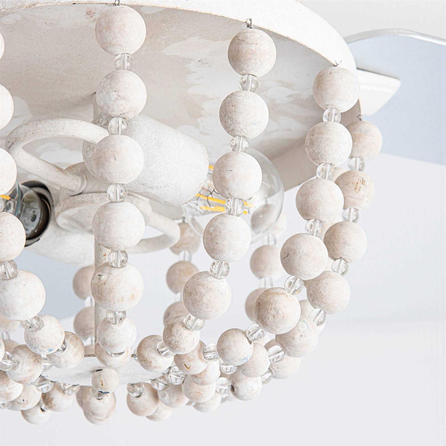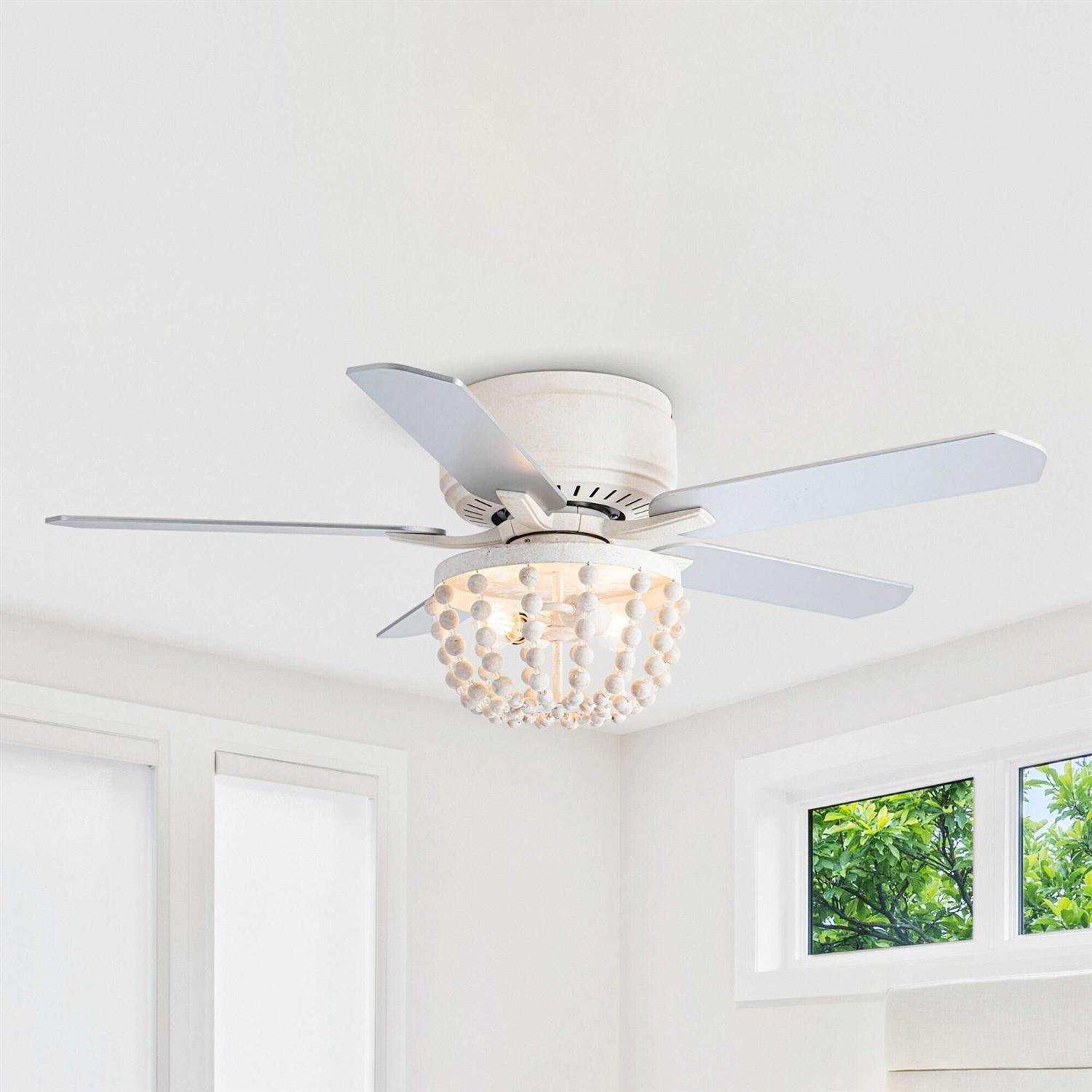 This beautiful 48 in. white farmhouse low profile ceiling fan is the perfect blend of style and functionality. It comes with a remote control, allowing you to adjust the fan speed and light on/off settings from anywhere in the room. This flush mount ceiling fan features a reversible motor, which lets you change the direction of the fan from downdraft mode during the summer to updraft mode during the winter. The standout feature of this ceiling fan is its unique wood bead shade. This design element adds a touch of rustic charm to the fan, making it an attractive centerpiece in any room. The shade also diffuses the light from the bulbs, creating a warm and inviting ambiance.