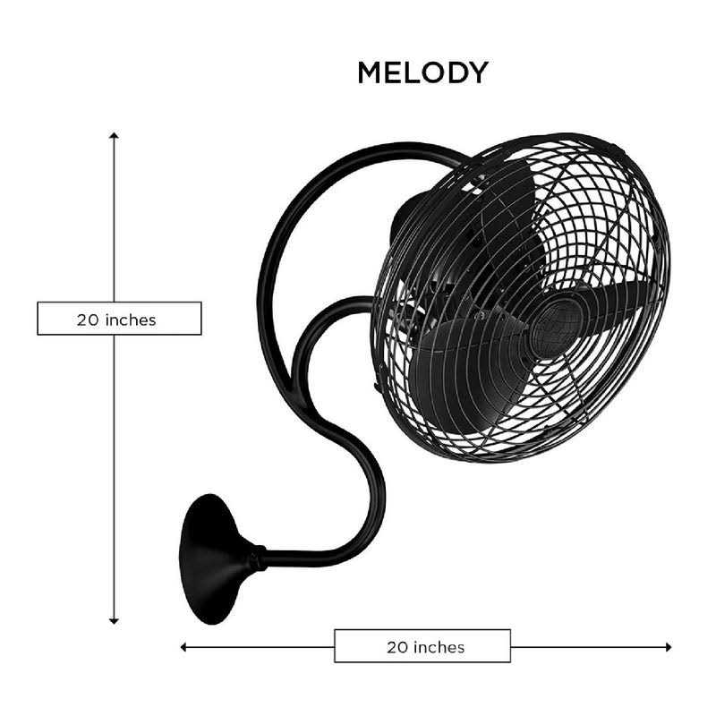 Melody is an oscillating, 3–speed wall-mounted fan designed in the Art Nouveau style with a grand, arching gooseneck that provides maximum multi-directional airflow with its 90o left to right sweep. Constructed from cast aluminum and heavy-stamped steel, Melody can be mounted in small, awkward spaces or in front of HVAC ducts to make more efficient the heating, ventilation or air conditioning of any space. It includes a decora-style wall switch controls both blade speed and oscillation mechanism.