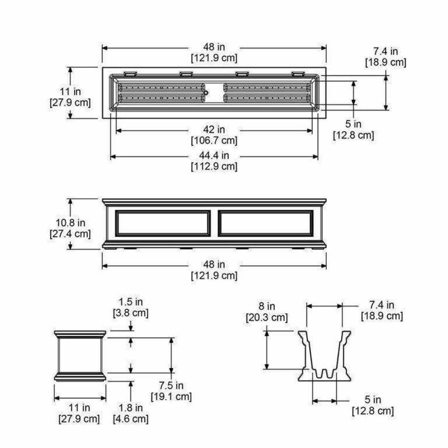 - Outside Dimensions: 48″L x 11″W x 10.8″H. Inside Dimensions: 44″L x 7.5″W x 8″D.