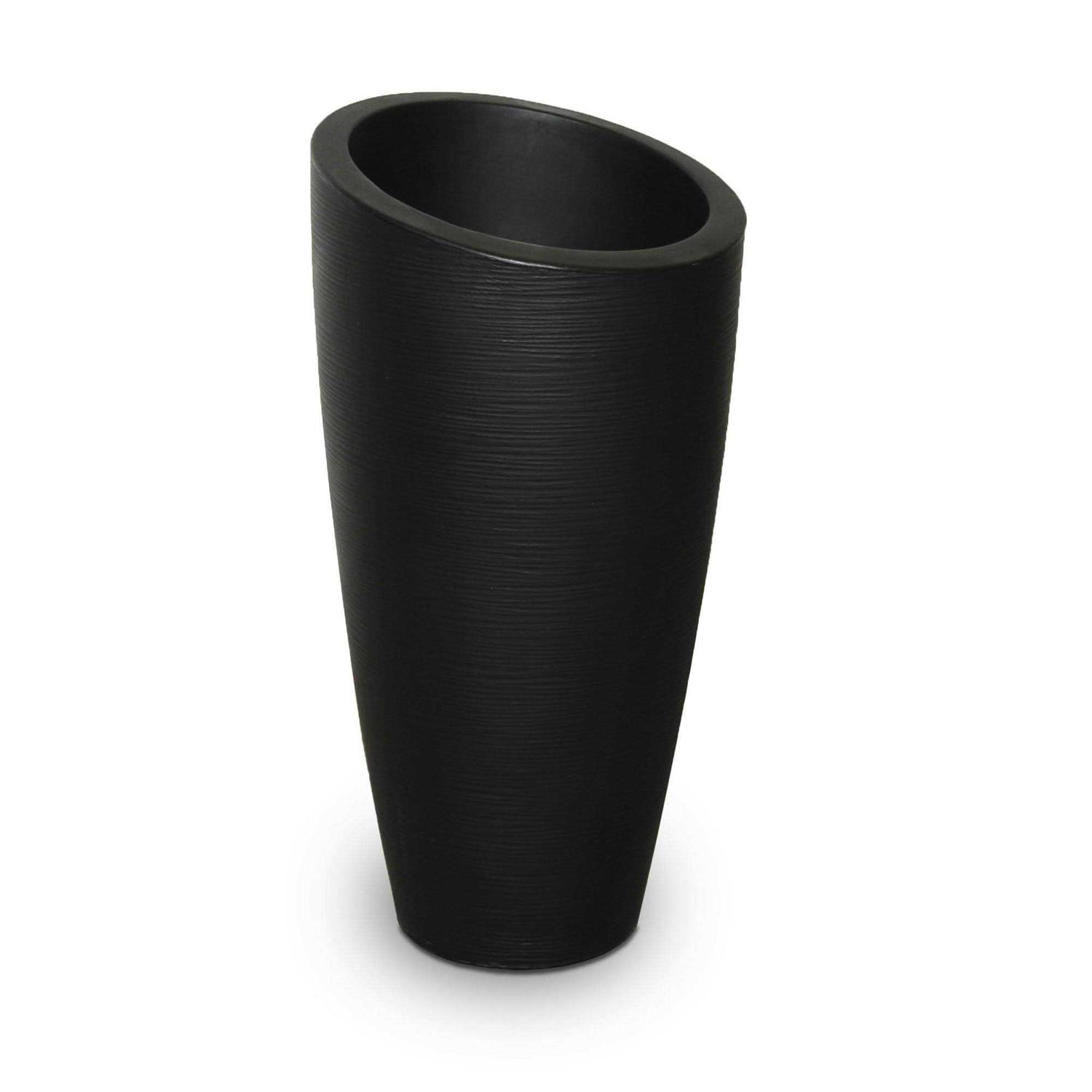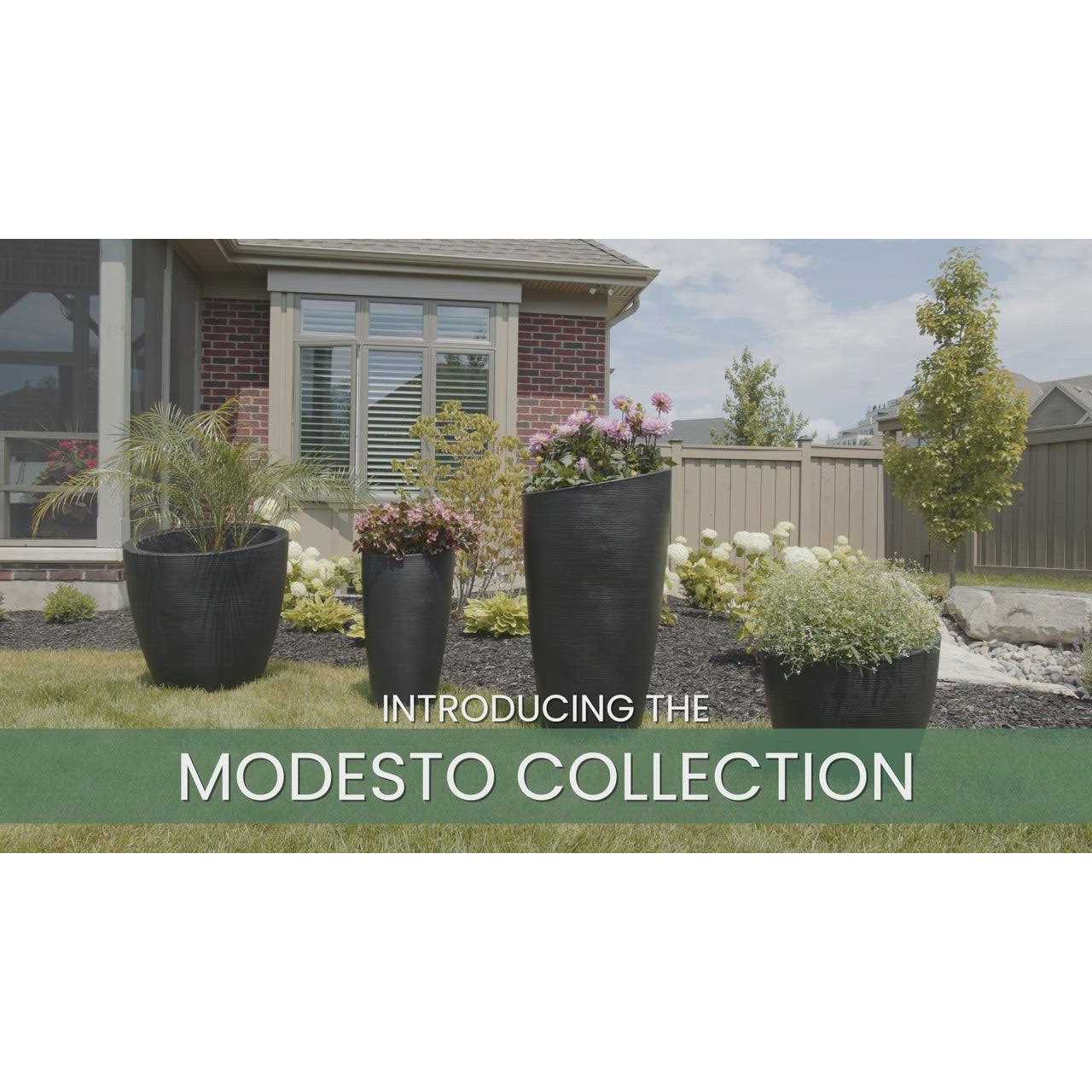 With a sloped top and grooved texture, the Modesto collection offers a bold twist to a contemporary design that truly captures the elusive flair of European styling. Its hard to believe such beauty and elegance can be found in a form that appears so simple and uncontrived. Make a statement with this highly functional and attractive planter. Double wall design, textured finish for increased durability. Soil Capacity is 6 Gallons (22.7 Liters). The weather-proof and ultra-tough construction allows you to enjoy your planter all year long with very little winter preparation.