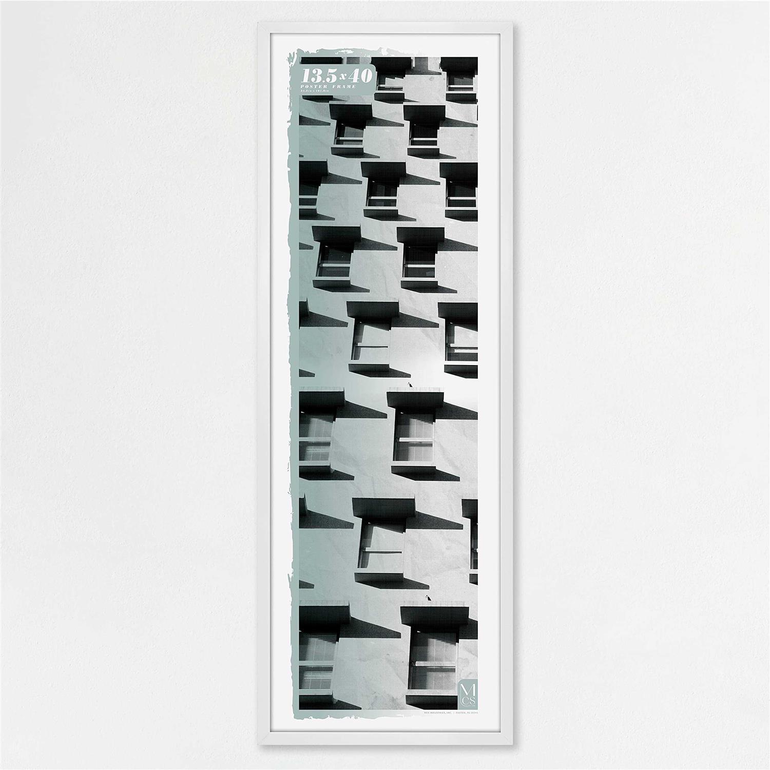MODERN DESIGN: Frame features a 0.75 inch wide by 0.8 Inch deep profile and sleek white finish for a contemporary display of your poster frames or art prints DIMENSIONS: Frame measures 14.3x 40.8 x 0.8 inches and holds one 13.5×40 inch photo, poster, or art print QUALITY CONSTRUCTION: Each frame is constructed of durable extruded plastic material and features a clear plexi front that provides protection from dust and dirt EASY TO USE: Includes pre-attached sawtooth hangers for vertical or horizontal hanging; Just add your artwork and hang WALL DECOR: Perfect for displaying posters, prints or artwork in your home, office, or dorm room. With a passion for design, trend and functionality, MCS delivers best-in-class products that help make your house a home;