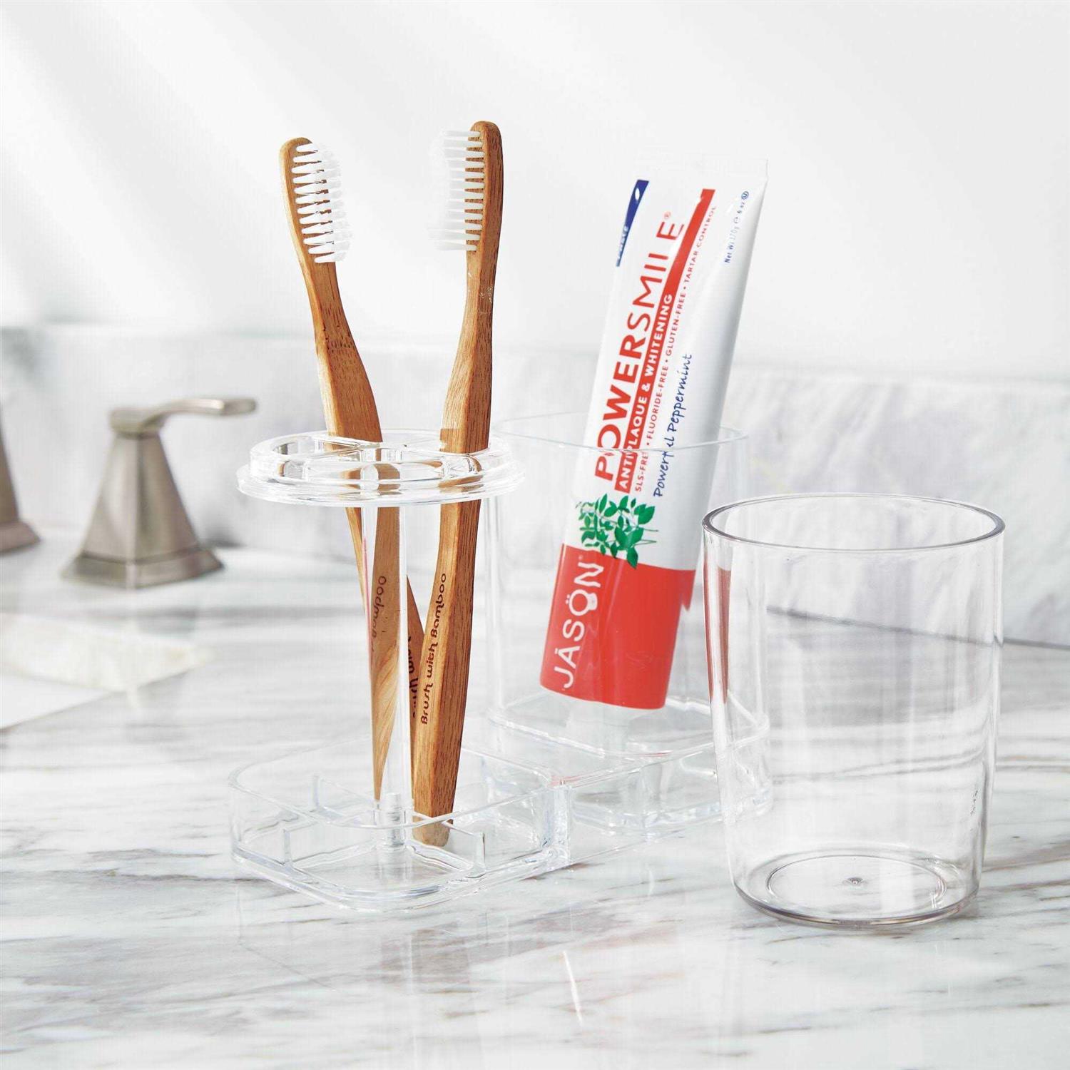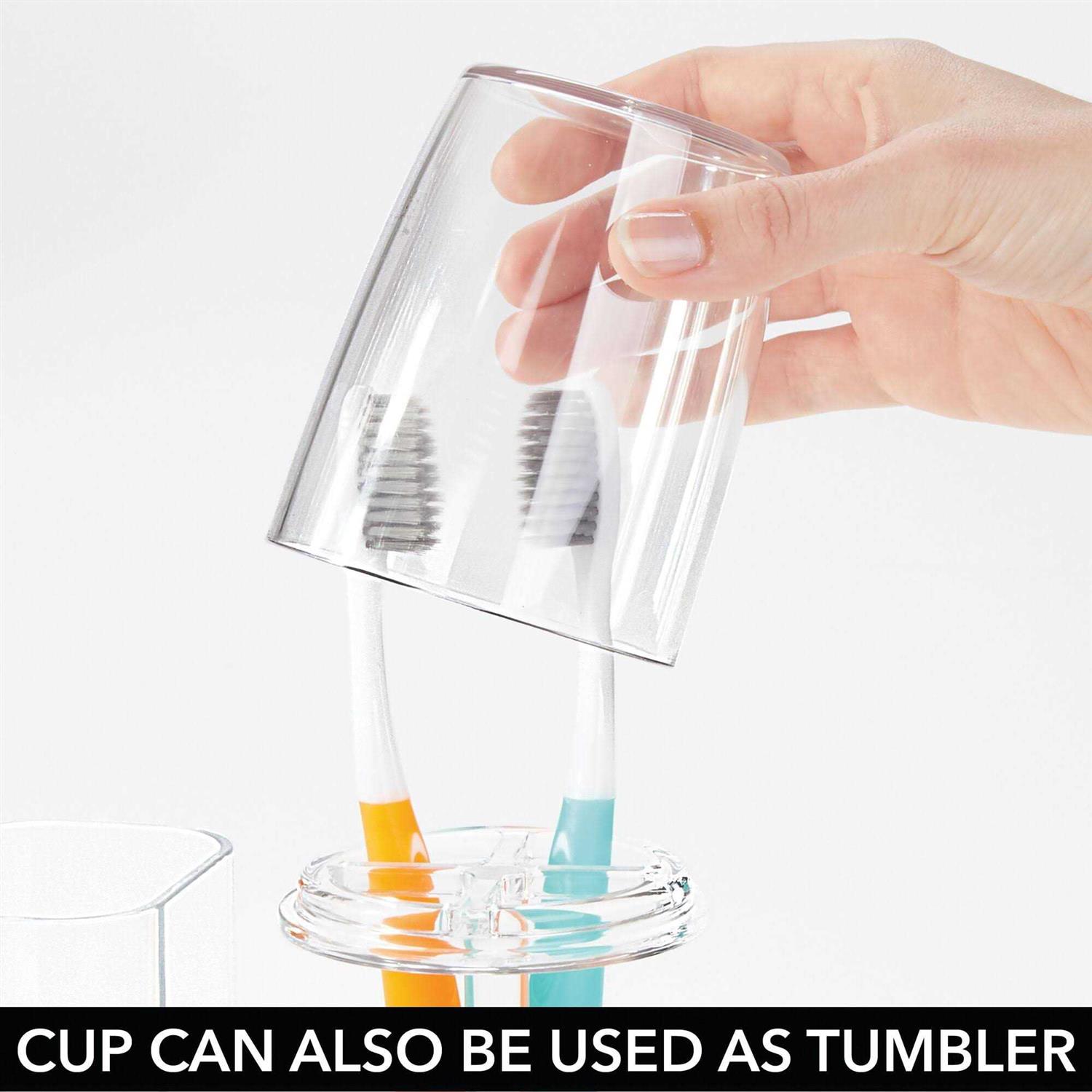 mDesign Toothpaste & Toothbrush Holder Stand with Rinsing Cup/Cover – Clear