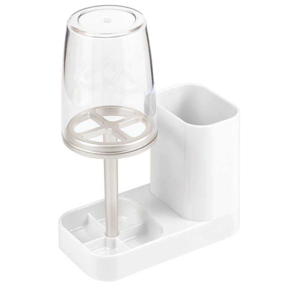 This Toothpaste & Toothbrush Stand stores daily dental hygiene necessities on the bathroom counter, vanity or even inside a medicine cabinet. This holder features a tumbler cup for rinsing that sits on top of the toothbrushes and cleaning instruments to keep them free of dust and debris. Its slim profile fits on the sink where space is limited.
