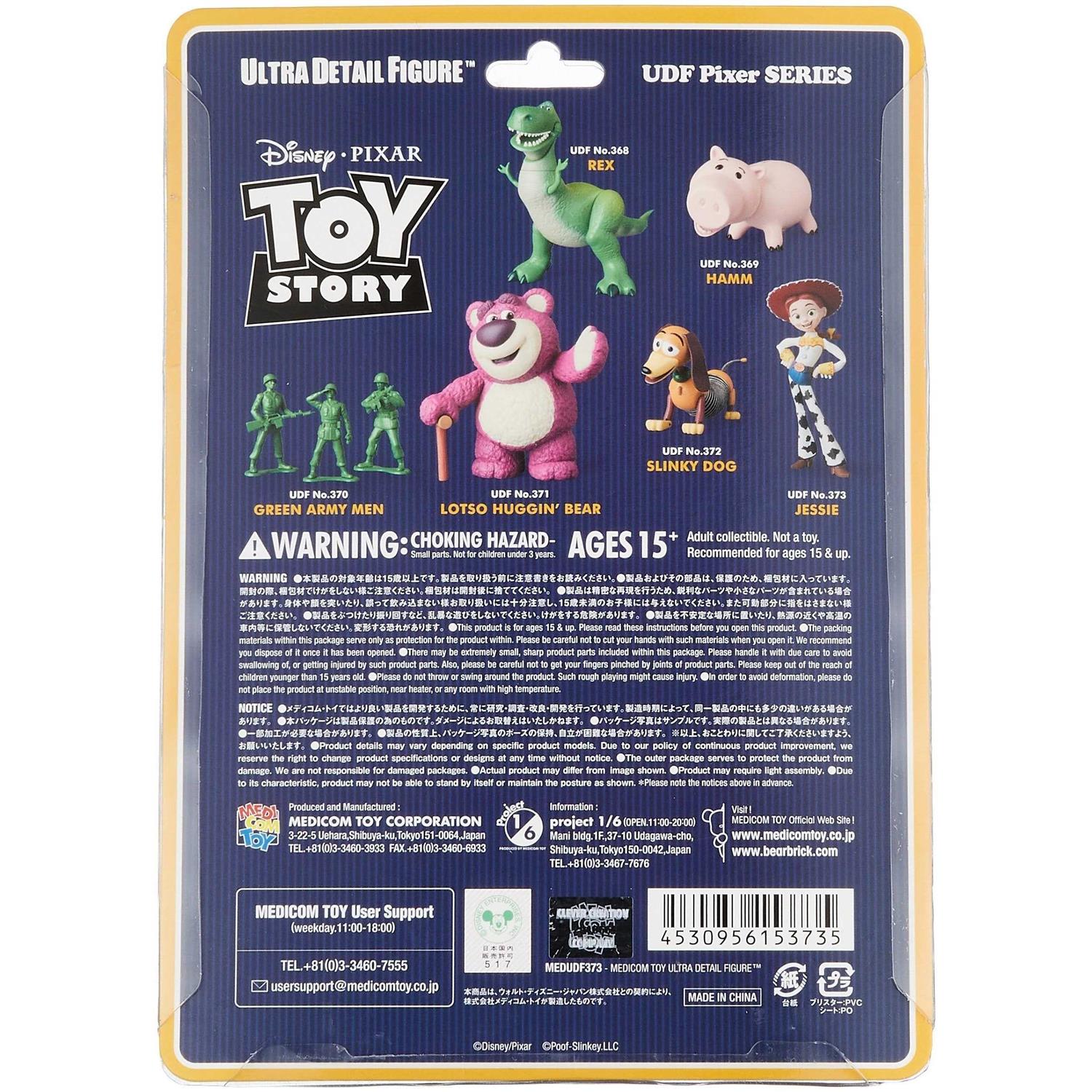 From Medicom. Disney has created some of the most memorable and popular characters of the past century, and Medicom celebrates the enduring creativity of Disney with their new Disney toy story udf (ultra detail figure) line-up. Disney collectors will find impressive versions of Jessie, Slinky dog, lots O hugging bear, Hamm, green army men and Rex.