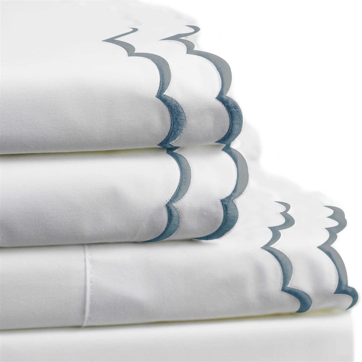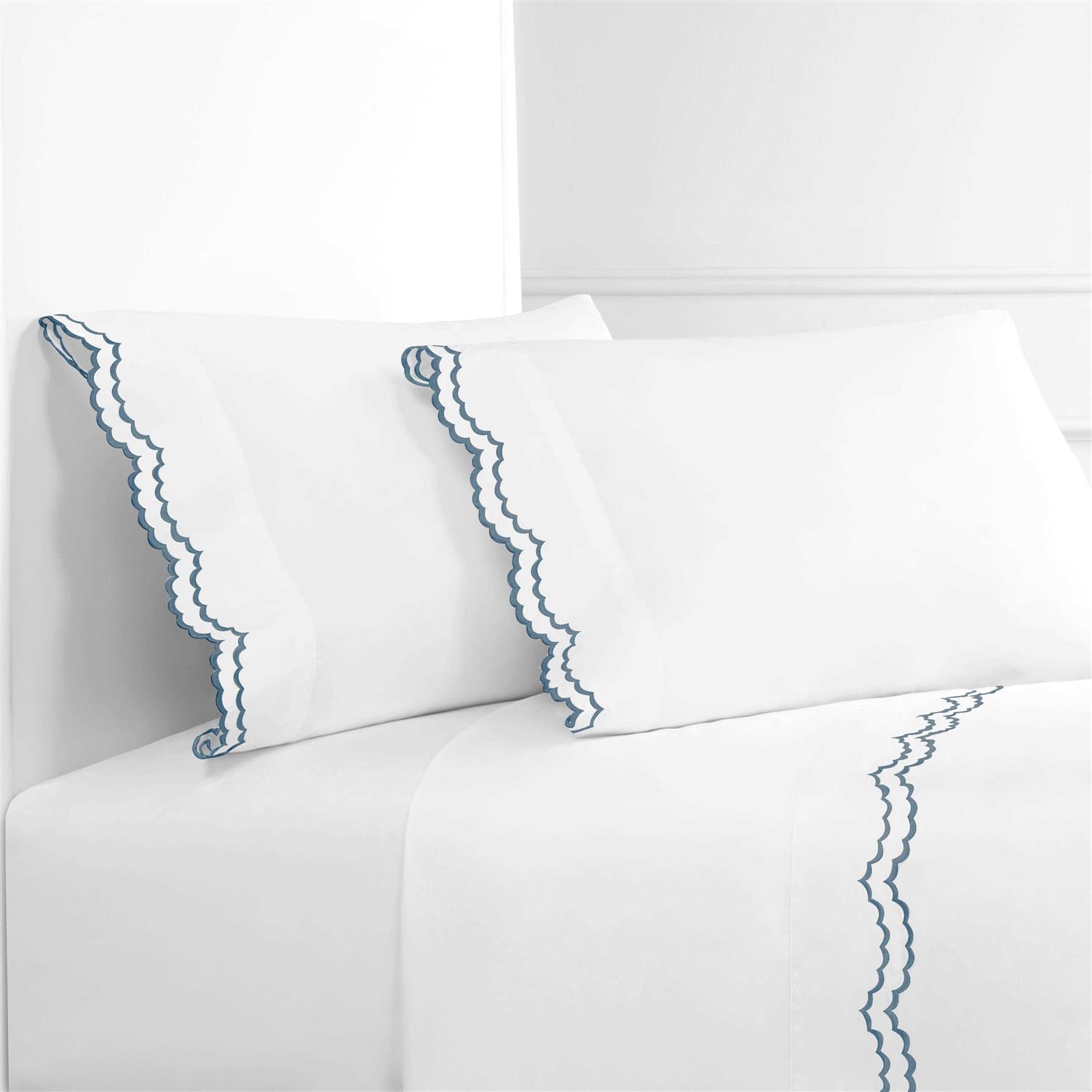 Experience the luxurious feel of our Percale Cotton Double Scalloped Embroidered Crisp Sheet Set. Made with extra fine, long-staple cotton, these sheets are woven with a one-to-one ratio of warp and weft threads to create a soft, durable, and cool-to-the-touch matte finish. The thin embroidered stripe adds a touch of style that enhances the contemporary, French country, or classic decor of any bedroom. Invest in the best bedding with our percale sheet set. Features: 300 thread count Matte finish Extra fine long staple cotton Embroidered scalloped border Eco-friendly materials Twin Sheet Set: 1 Flat sheet: 66 inches wide x 96 inches long 1 Fitted sheet: 39 inches wide x 75 inches long with a 15-inch pocket depth 1 Standard Pillowcase: 20 inches wide x 30 inches long Full Sheet Set: 1 Flat sheet: 81 inches wide x 96 inches long 1 Fitted sheet: 54 inches wide x 75 inches long with a 15-inch pocket depth 2 Standard Pillowcases: 20 inches wide x 30 inches long Queen Sheet Set: 1 Flat sheet: 90 inches wide x 102 inches long 1 Fitted sheet: 60 inches wide x 80 inches long with a 15-inch pocket depth 2 Standard Pillowcases: 20 inches wide x 30 inches long King Sheet Set: 1 Flat sheet: 108 inches wide x 102 inches long 2 Fitted sheet: 78 inches wide x 80 inches long with a 15-inch pocket depth 2 King Pillowcases: 20 inches wide x 40 inches long California King Sheet Set: 1 Flat sheet: 102 inches wide x 105 inches long 1 Fitted sheet: 72 inches wide x 84 inches long with a 15-inch pocket depth 2 King Pillowcases: 20 inches wide x 40 inches long Standard Pillowcases Set: 2 Standard Pillowcases: 20 inches wide x 30 inches long King Pillowcases Set: 2 Standard Pillowcases: 20 inches wide x 40 inches long