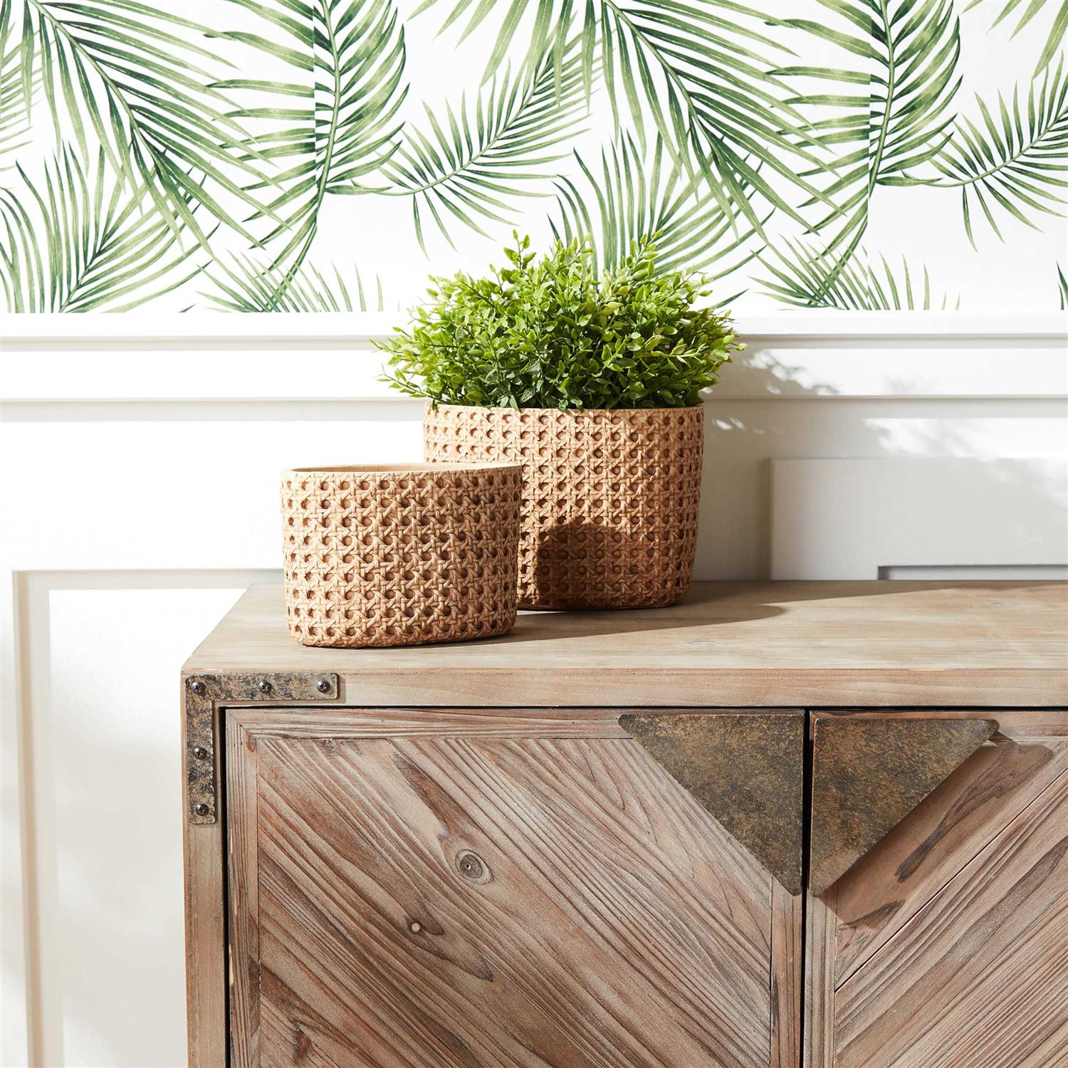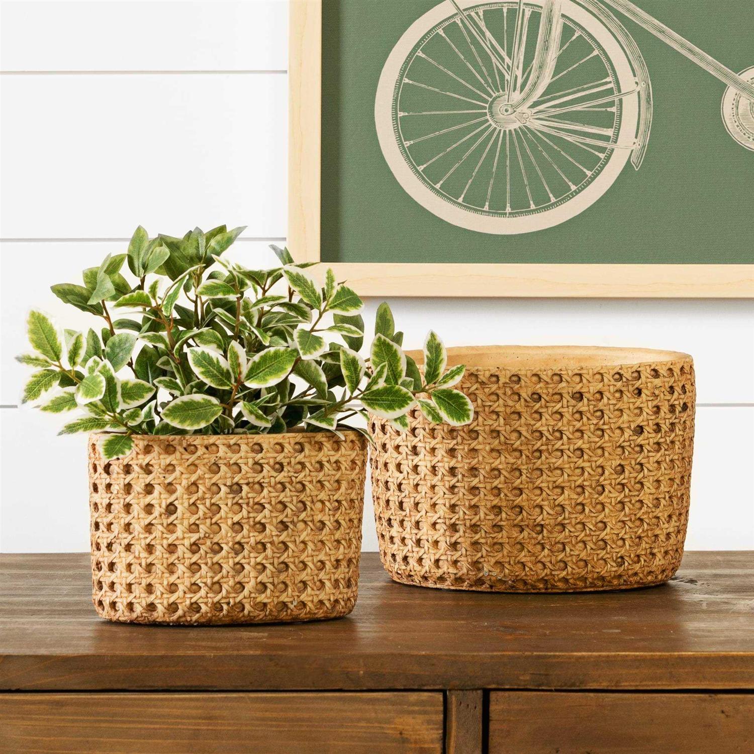 Display your plants in style with this beautiful set of Faux-Rattan Decorative Stone Pots. Featuring two assorted sizes, the natural-looking, faux-rattan design paired with the sturdy cement composition is the perfect combination to create a stunning display. This set is great for both indoor and outdoor covered use. Complete the look by dropping in a faux potted plant or silk tree.