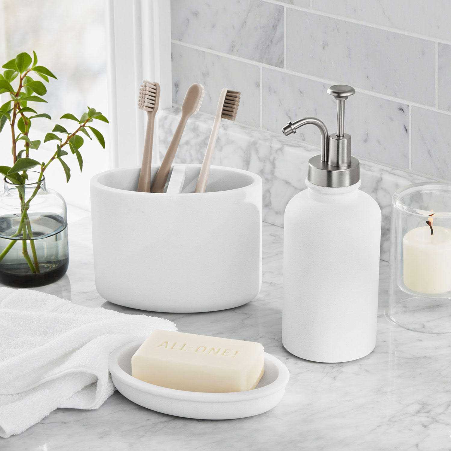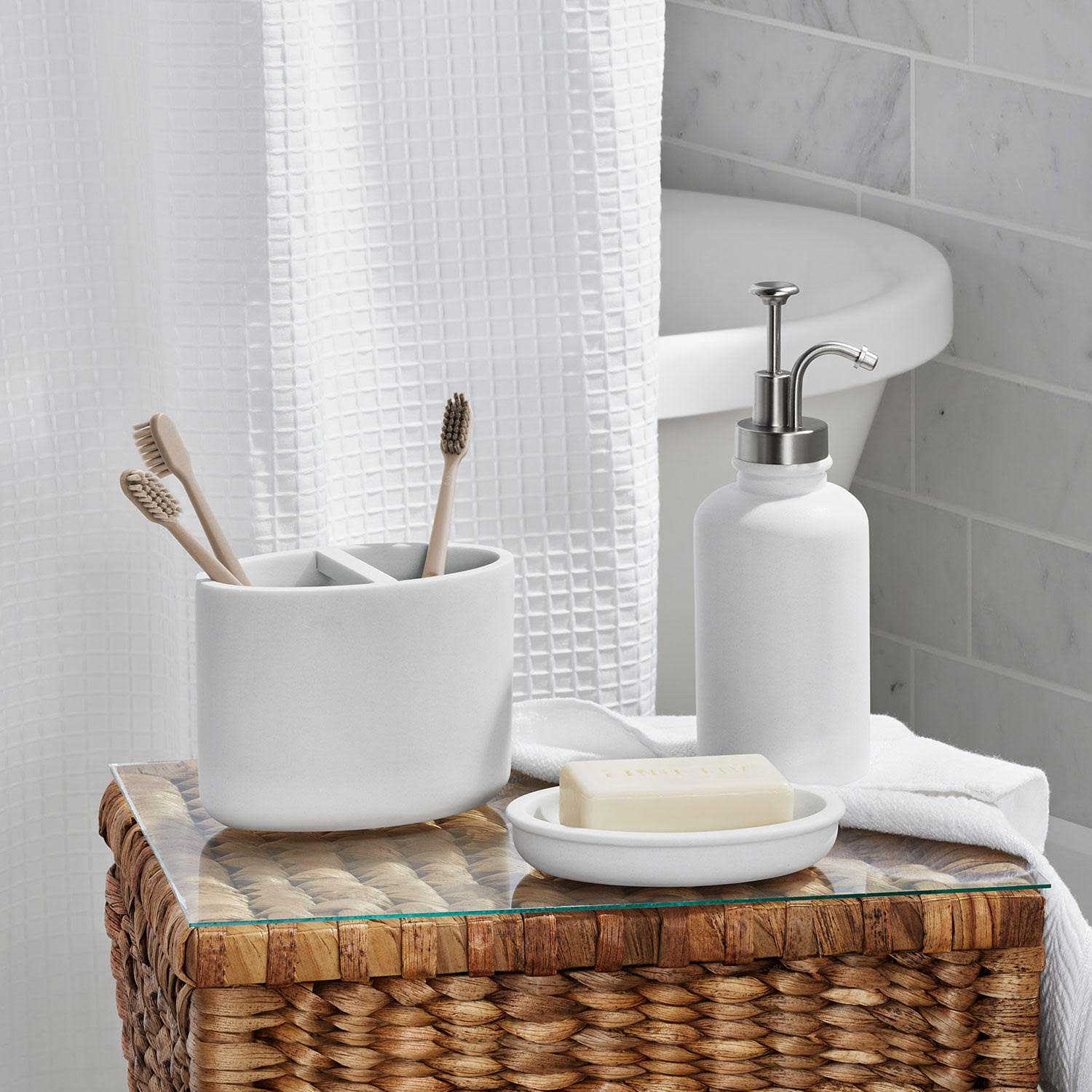 Included in the bath set is a woven shower curtain made of 100% polyester measuring 70′ x 72′, a clear 70′ x 70′ peva liner with added weight grommets at the bottom to keep the liner secure, 12 decorative rust-resistan metal shower hooks for easy installation, a color-coordinating frosted poly resin dispenser, a matching frosted poly resin toothbrush holder, and a frosted poly resin soap dish to complete the look.