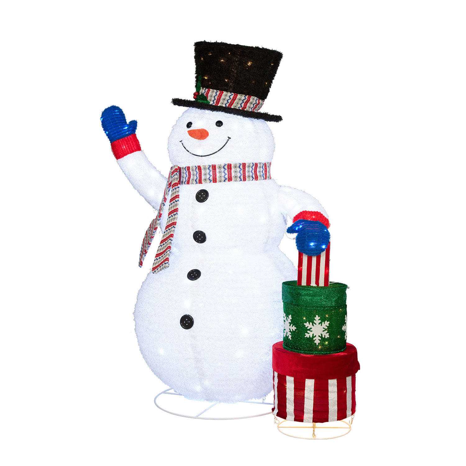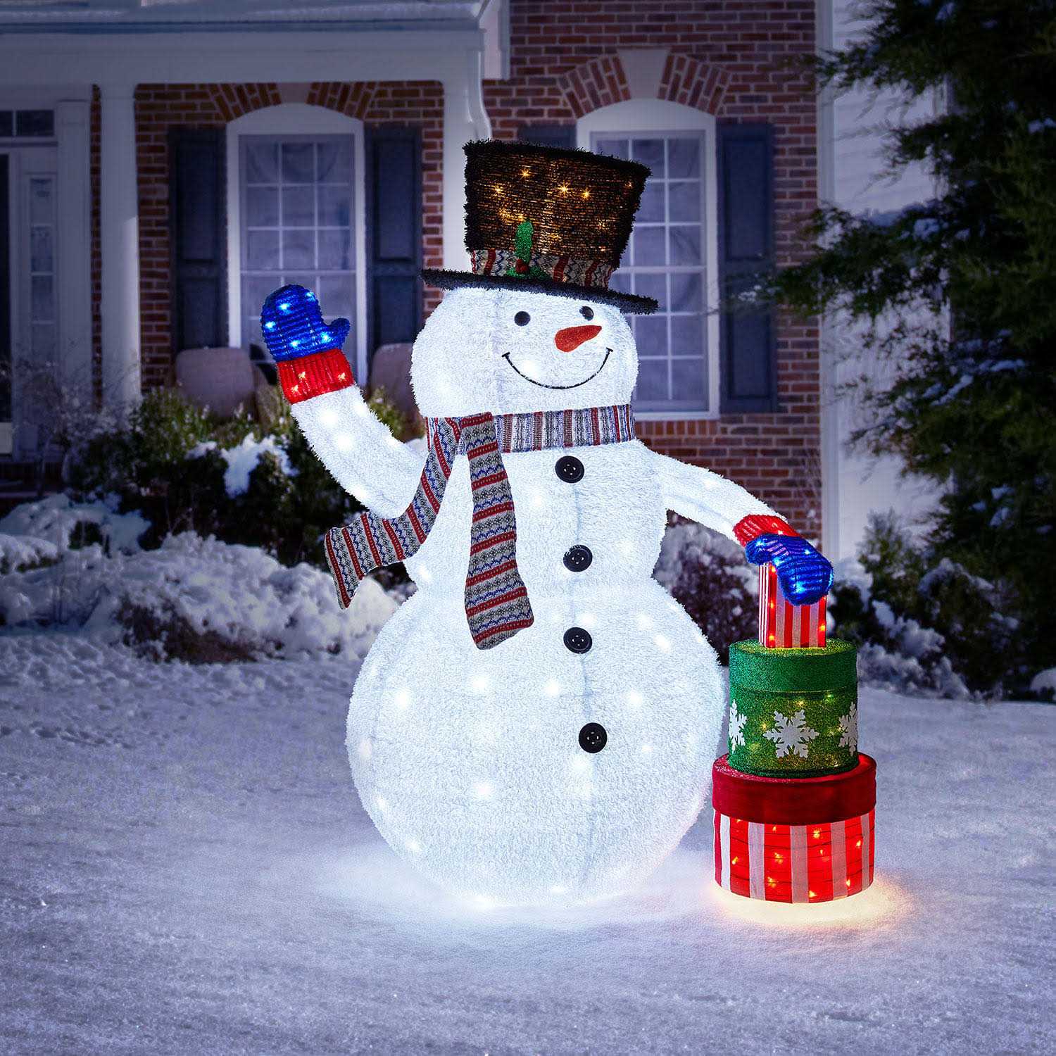Give your front, side, or back yard a festive makeover and welcome the holiday season with Member’s Mark 72′ Pre-lit Pop-Up Twinkling Snowman. Available exclusively at Sam’s Club, this bright and cheery snowman is made with realistic snow-like material, comes with 260 LED lights with twinkling effect and stands high at 6-feet tall. The set also includes 4 yard stakes, a 5-foot (1.52m) lead cord and a UL-listed outdoor adaptor. Recommended for both indoor and outdoor use, the snowman features a pop-up construction that can be assembled in quick and easy steps and lies flat for easy storage after the holidays are over.The twinkling effect provides a unique and special lighting effect, and the large light count ensures extra brightness for your yard at night. Member’s Mark Twinkling Snowman is sure to provide a warm welcome to your family, friends, and neighbors with his sparkling eyes and big smile. Wearing a black top hat, mittens and a snowflake printed scarf the snowman is leaning on a stack of gifts while waving to passersby. This snowman is sure to create a vibrant and dramatic presentation with his commanding presence. With long life LED bulbs, this twinkling snowman will continue to shine bright throughout many holiday seasons and is sure to become a family favorite for many years. LED bulbs have a long bulb life which is 25,000 hours on average. This long life is environmentally friendly as it equals fewer resources used over time. An additional sustainability feature is that the packaging for the snowman is recyclable.