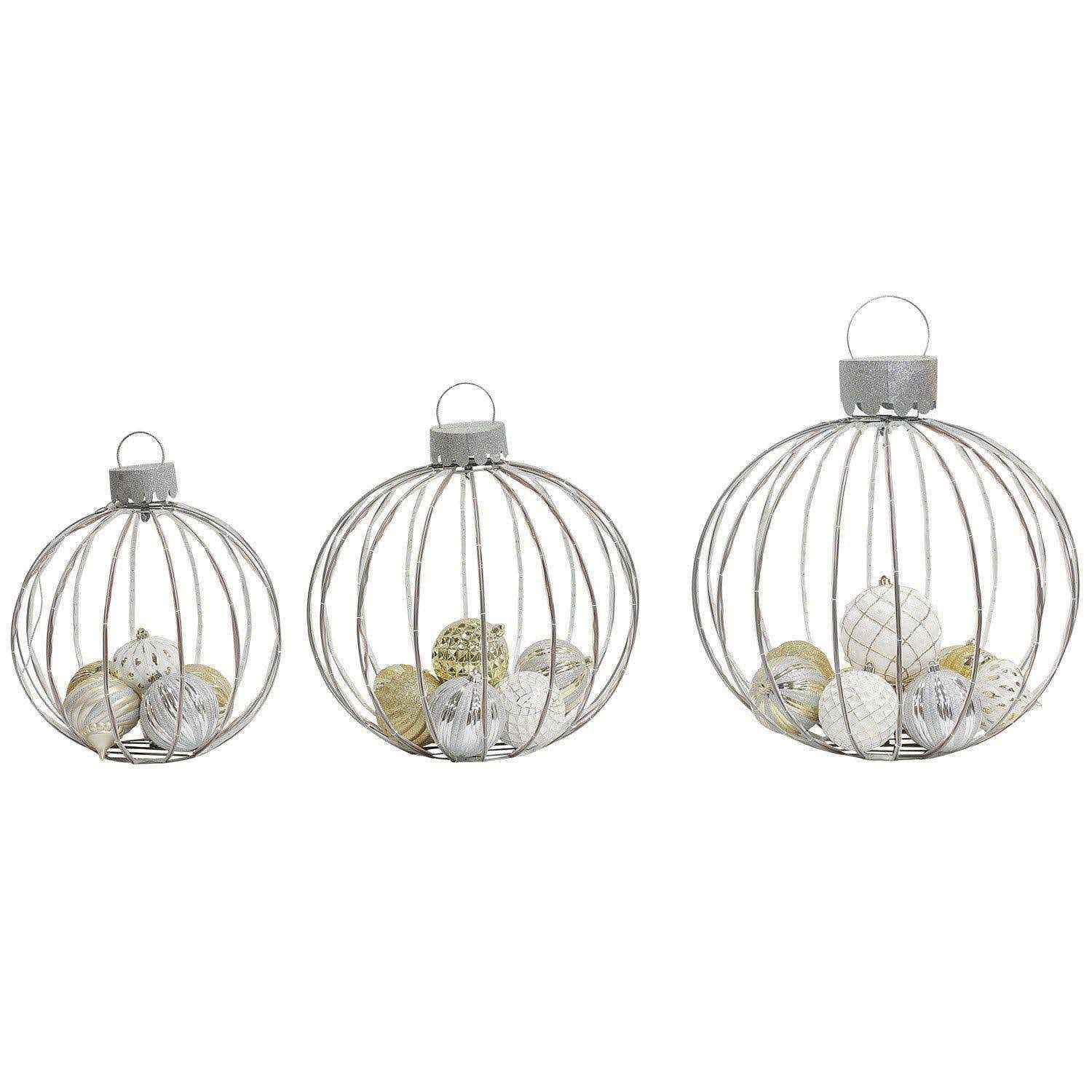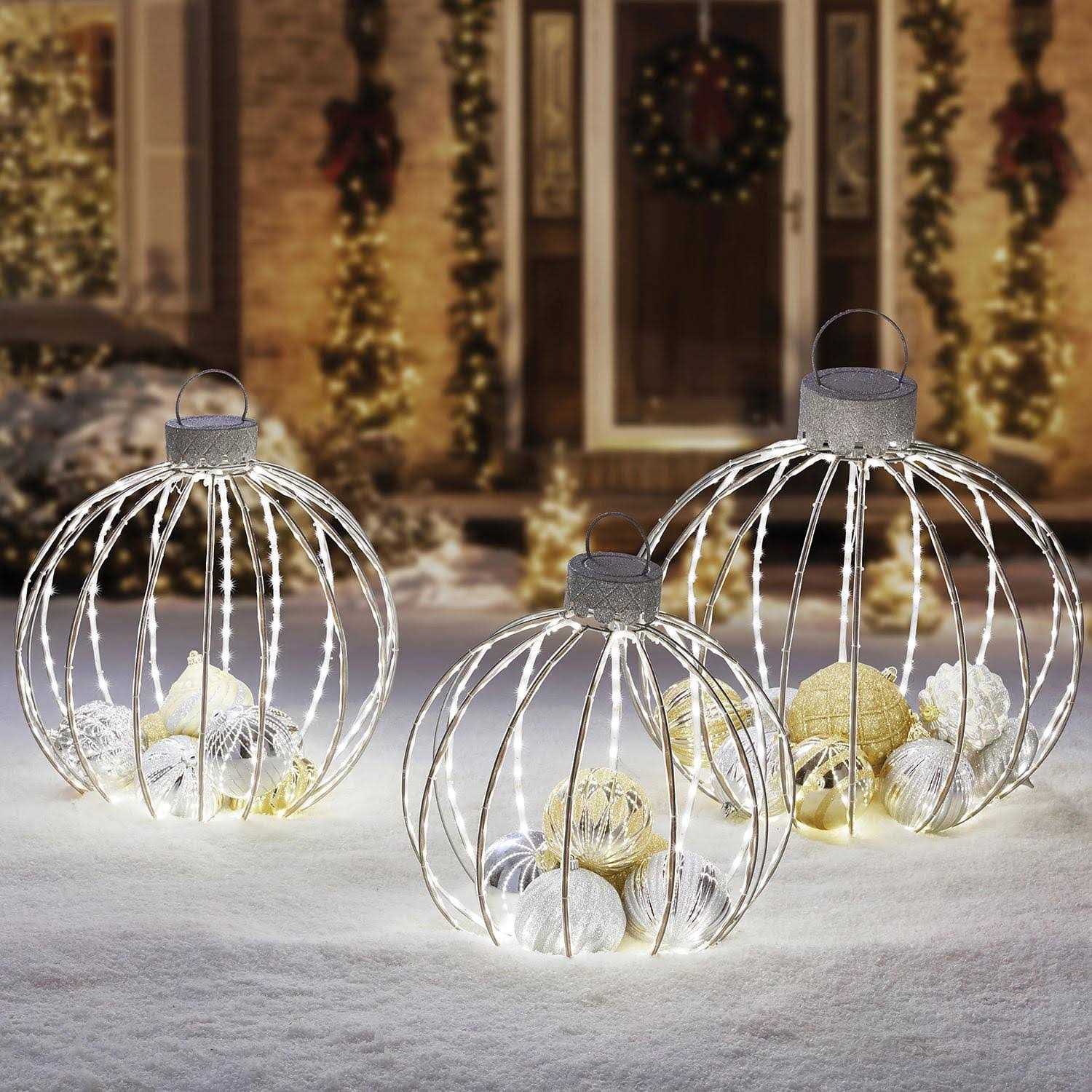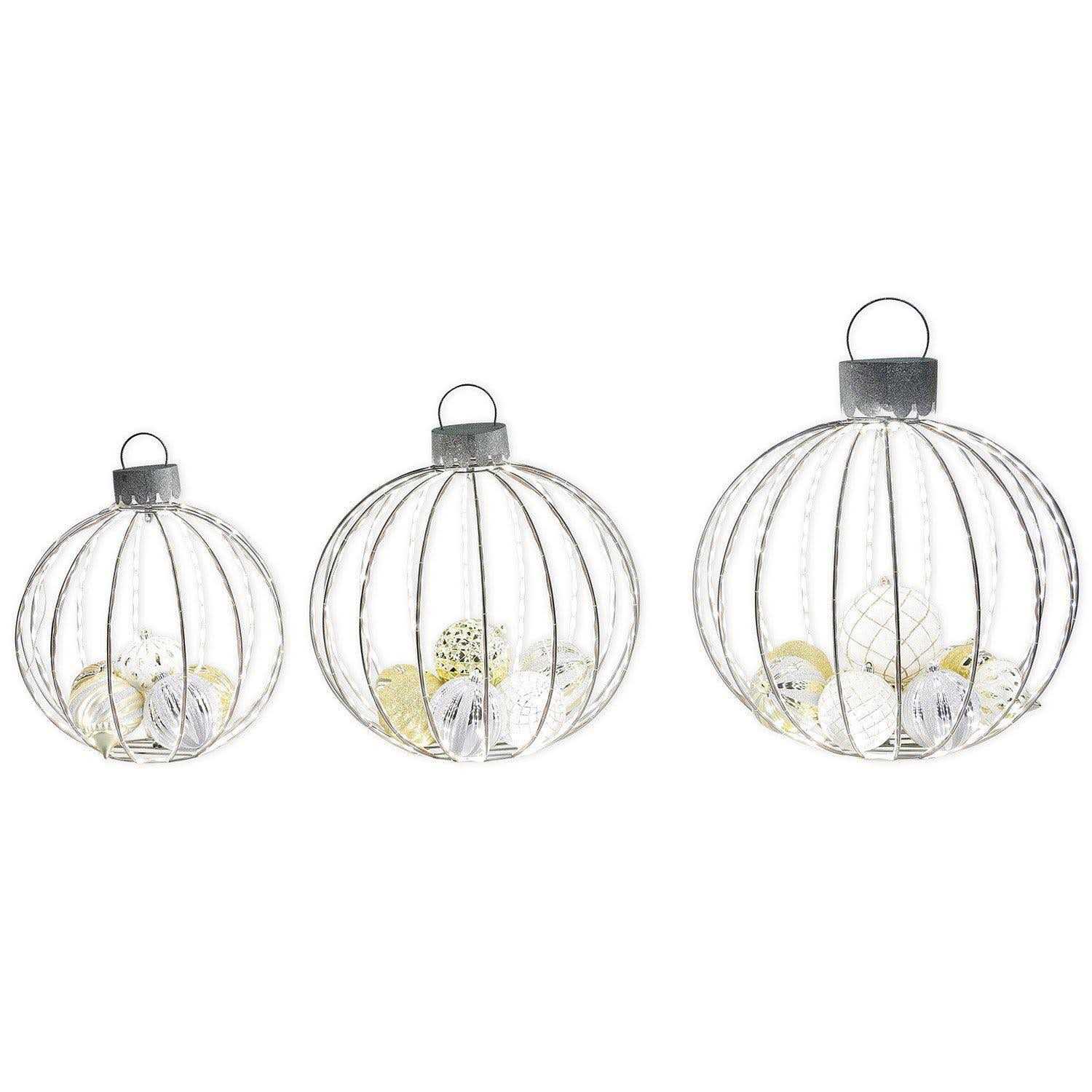 Three pre-lit jumbo wire ornaments enclose an assortment of smaller shatterproof ornaments, lighting up the season, and the neighborhood, in glamorous style. The three metal ornaments feature a captivating twinkling function, and can be displayed as a trio or added to other pieces to create a dazzling holiday scene. The smaller shatterproof ornaments feature coordinating striped or solid and a textured finish in brilliant gold and silver. These gorgeous metal pre-lit ornament decorations can be used in a wide variety of ways stake them into the ground, hang them from the trees or arrange them near a doorway for a brilliant welcome. They make a fabulous display near a Christmas tree or in a foyer, adding sparkle and shine to the holiday season. With 840 cool white LED lights with a twinkling function and a 9.84-foot lead cord, not only is this set sure to light up the night but it’s also quick and easy to set up. LED lights makes these ornaments standout against the dark winter night and instantly elevates the look of your home this holiday season.