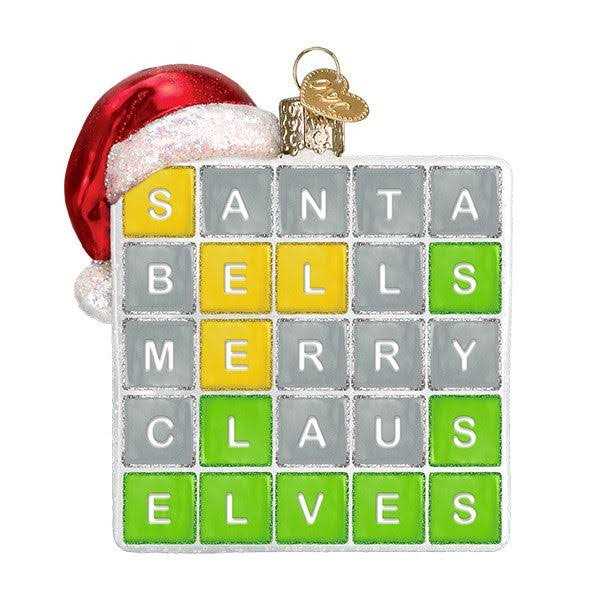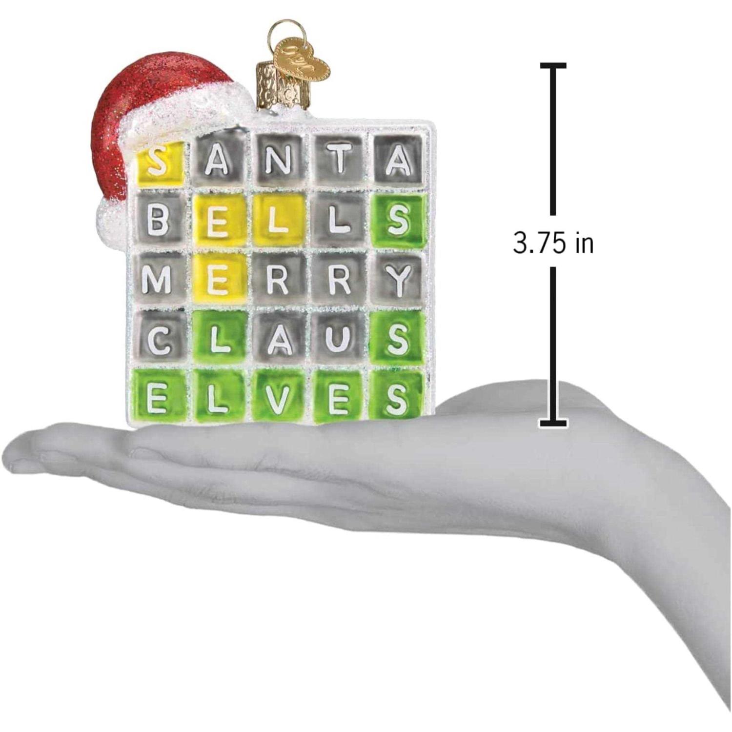 How many words can you spy on this Merry Words ornament fromOld World Christmas? Product Details Each glass ornament ismouth-blown into finely carved molds for exceptional color and vibrance Fully dimensional and hand-painted/glittered on all sides for a fine finish Heart depicts OWC Trademark Logocertifying that it is an Old World original Comes in a free Old World box foreasy gift-giving & storage Game apps are a great way to passtime, but word games take the grand prize for entertainment. Not only are thegames fun to play, but they stretch your mind and exercise your brain. Santaand his elves compare their scores daily. This ornament is perfect to hang onyour Christmas tree or displayed in an ornament hanger on your mantle, shelvesor tabletop.
