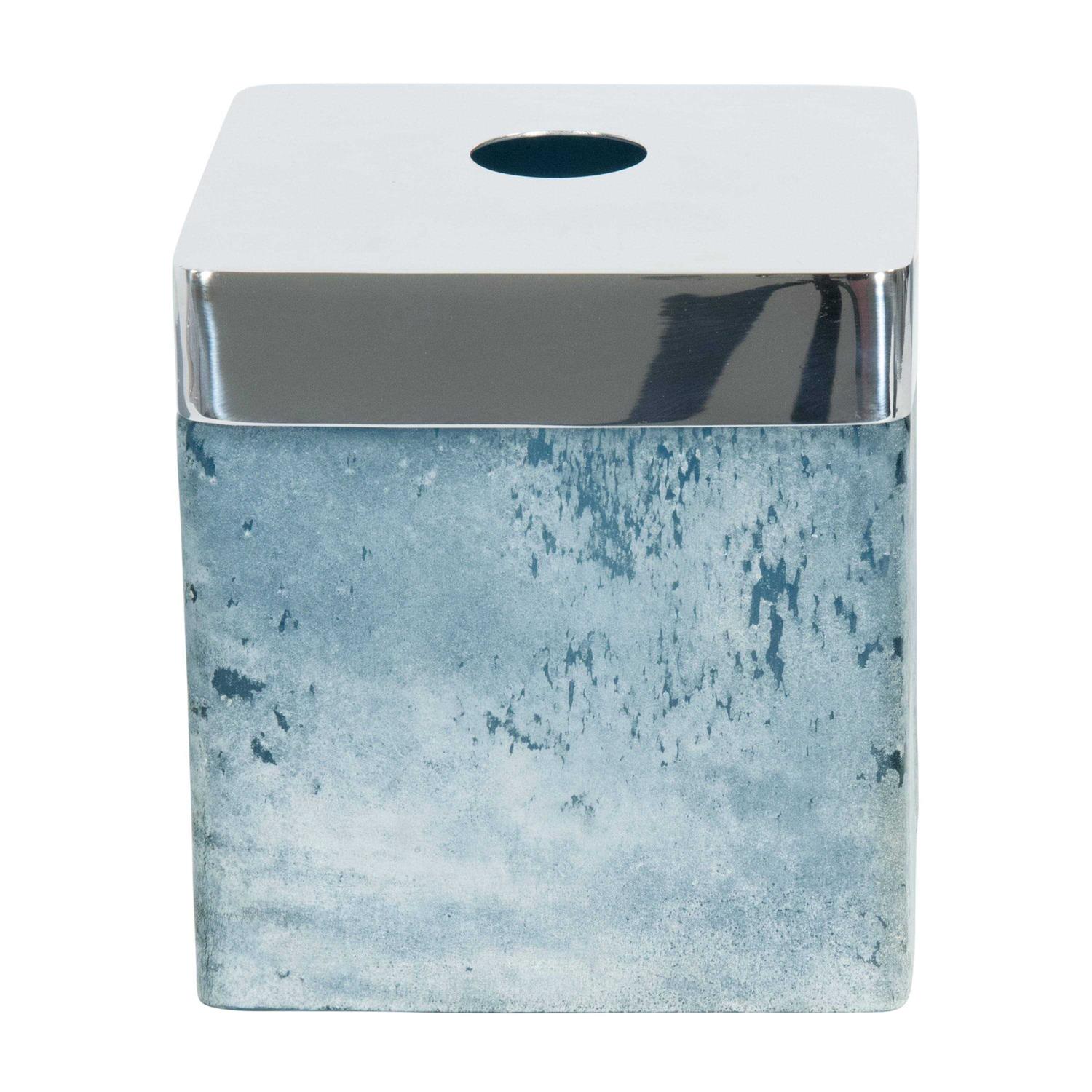 Textured glass tissue box cover from the Ocean Reef collection. Glass/stainless steel. Hand wipe with damp cloth. 5.8″L x 5.8″W x 6.4″T. Imported.