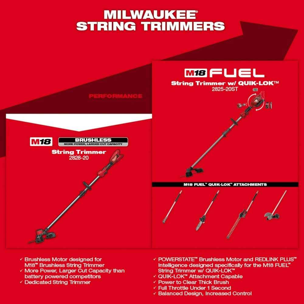 Milwaukee Powerstate Brushless Motor provides more power, more run-time, and longer life. The brushless motor was built and optimized specifically for trimming applications and provides up to 6,200 RPM. Features high and low speed settings with a variable speed trigger. High-speed provides the power to take on demanding applications, and low-speed maximizes run-time while having plenty of power for grass trimming. Adjustable Cutting Swath 14 In. for maximizing run-time and 16 In. for increased clearing capacity. The Easy Load Trimmer Head delivers an easy line loading experience and the ability to load up to 25 Ft. of trimmer line in under 30 seconds. The Milwaukee RedLithium Battery Pack is the most durable pack on the market. RedLink Plus Electronic Intelligence and M18 RedLithium High Output battery enables advanced communication between your batteries and tools, allowing for unmatched levels of performance, protection, and productivity. This cordless string trimmer is a part of the M18 System.