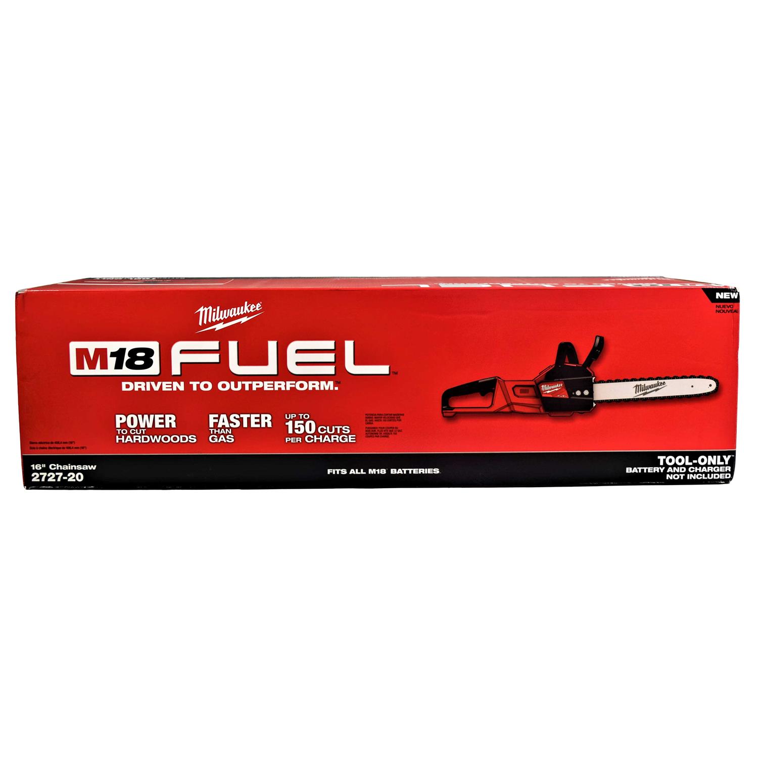 The Milwaukee M18 Fuel 16-inch chainsaw delivers the power to cut hardwoods, cuts faster than gas and delivers up to 150 cuts per charge. Provide the power and performance of a gas engine up to 40CC. The unit is designed to meet the performance, durability and ergonomic needs of professional landscape maintenance, power utility and the installed M18 user. The Powerstate brushless motor maintains speed under heavy loads without bogging down to outperform small gas engines and higher voltage systems. Redlink Plus intelligence ensures maximum performance and protection from overload, overheating and over-discharge. The M18 RedLithium high output HD12.0 battery delivers unmatched run-time in all applications. M18 Fuel technology allows the unit to reach full throttle in under 1 second providing ultimate control and productivity.