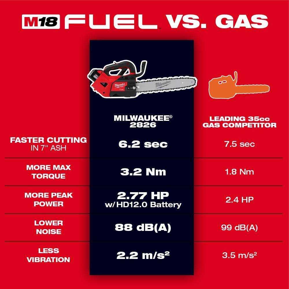 The Milwaukee M18 FUEL 14′′ Top Handle Chainsaw Kit cuts faster than 35cc gas, delivers the power to cut hardwoods, and eliminates the headaches associated with gas engines. The saw is designed to meet the performance, durability, and ergonomic needs of the professional arborist, power utility linemen, and landscape maintenance professional. M18 FUEL technology allows the saw to reach full throttle in under 1 second providing ultimate control and cut faster than 35cc gas for increased productivity. The POWERSTATE Brushless Motor maintains speed under heavy loads without bogging down to outperform small gas engines and higher voltage systems. In addition to outperforming gas competitors, the saw eliminates all of the headaches associated with gas engines, such as pull starts, high noise levels, emissions, and regular maintenance. The REDLINK PLUS Intelligence enables full-circle communication between the tool and battery, providing you with unmatched levels of performance, protection, and productivity. The saw has a professionally demanded feature set including an easy access chain tensioner, automatic oiler, metal bucking spikes, onboard scrench storage, lanyard loop, and climbing scabbard. The M18 FUEL 14′′ Top Handle Chainsaw is compatible with 250+ solutions on the M18 system.