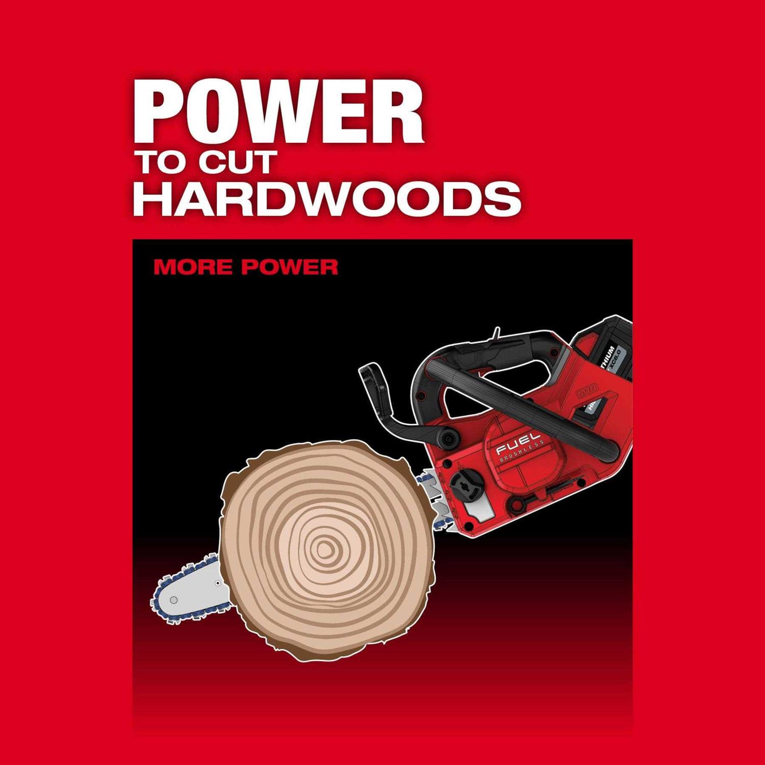 The Milwaukee M18 Fuel 14 inch Top Handle Chainsaw delivers the power to cut faster than gas and delivers up to 180 cuts per charge. The unit is designed to meet the performance durability and ergonomic needs of professional tree service and power utility. The Powerstate Brushless Motor maintains speed under heavy loads without bogging down to outperform gas engines and higher voltage systems. Redlink Plus intelligence ensures maximum performance and protection from overload overheating and over discharge. When paired with the M18 Redlithium High Output XC8.0 battery (sold seperately) the unit delivers unmatched run-time in all applications. M18 Fuel technology allows the unit to reach full throttle in under 1 second providing ultimate control and productivity.