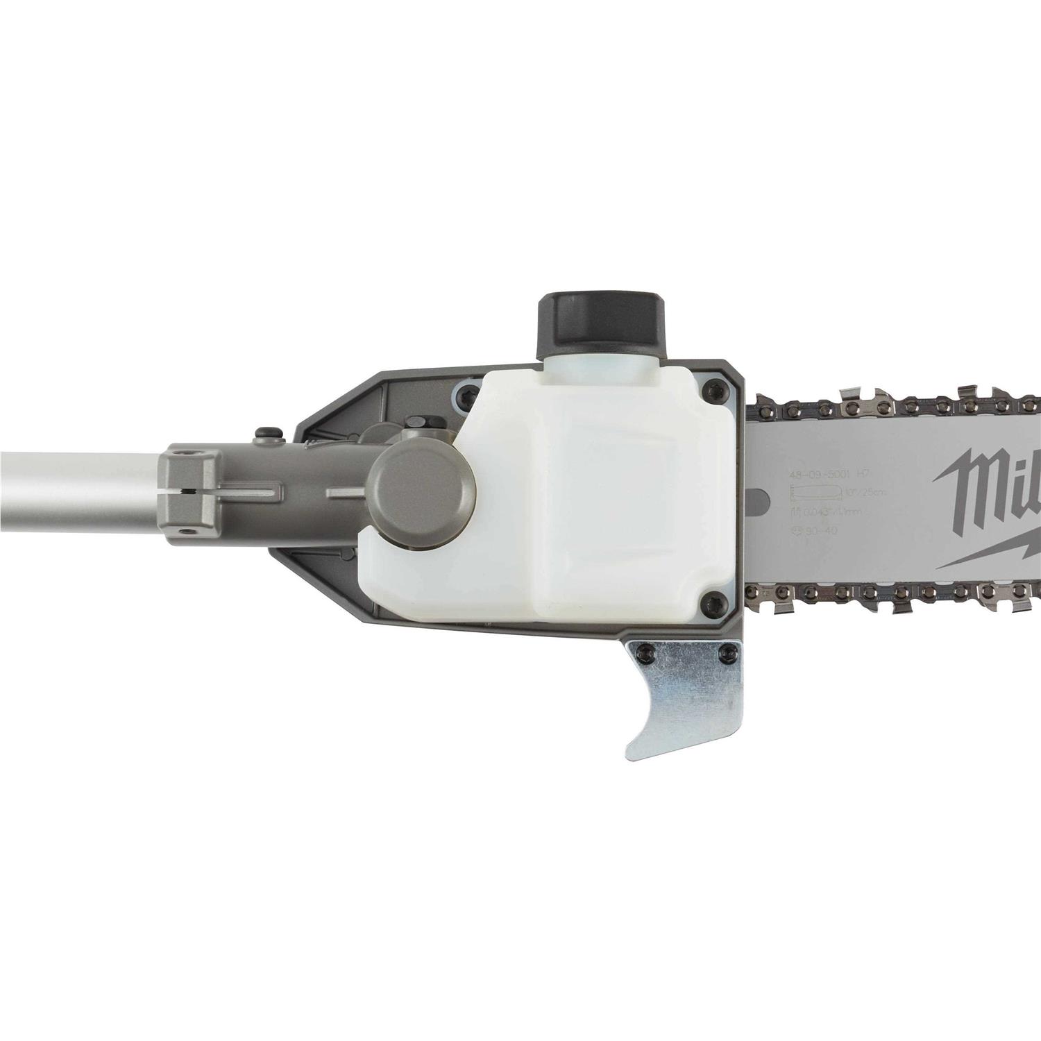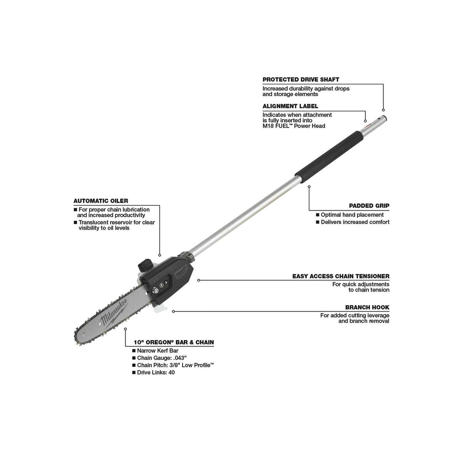 The M18 Fuelr Quik-Lokr 10″ pole saw attachment is powered by the M18 Fuelr Power Head with Quik-Lokr and is compatible with the Quik-Lokr attachment system. Features a 10″ Oregon bar and chain which provides you with smooth and fast cuts with minimal kickback. The pole saw attachment includes an automatic oiler for proper chain lubrication, easy access chain tensioner for quick adjustments to chain tension and a branch hook for added cutting leverage and branch removal. The Quik-Lokr attachment features protected drive shafts for increased durability against drops and storage elements. The pole saw attachment also utilizes optimized gearing to manage the cordless M18 Fuelr power head RPM output specifically for cutting applications.