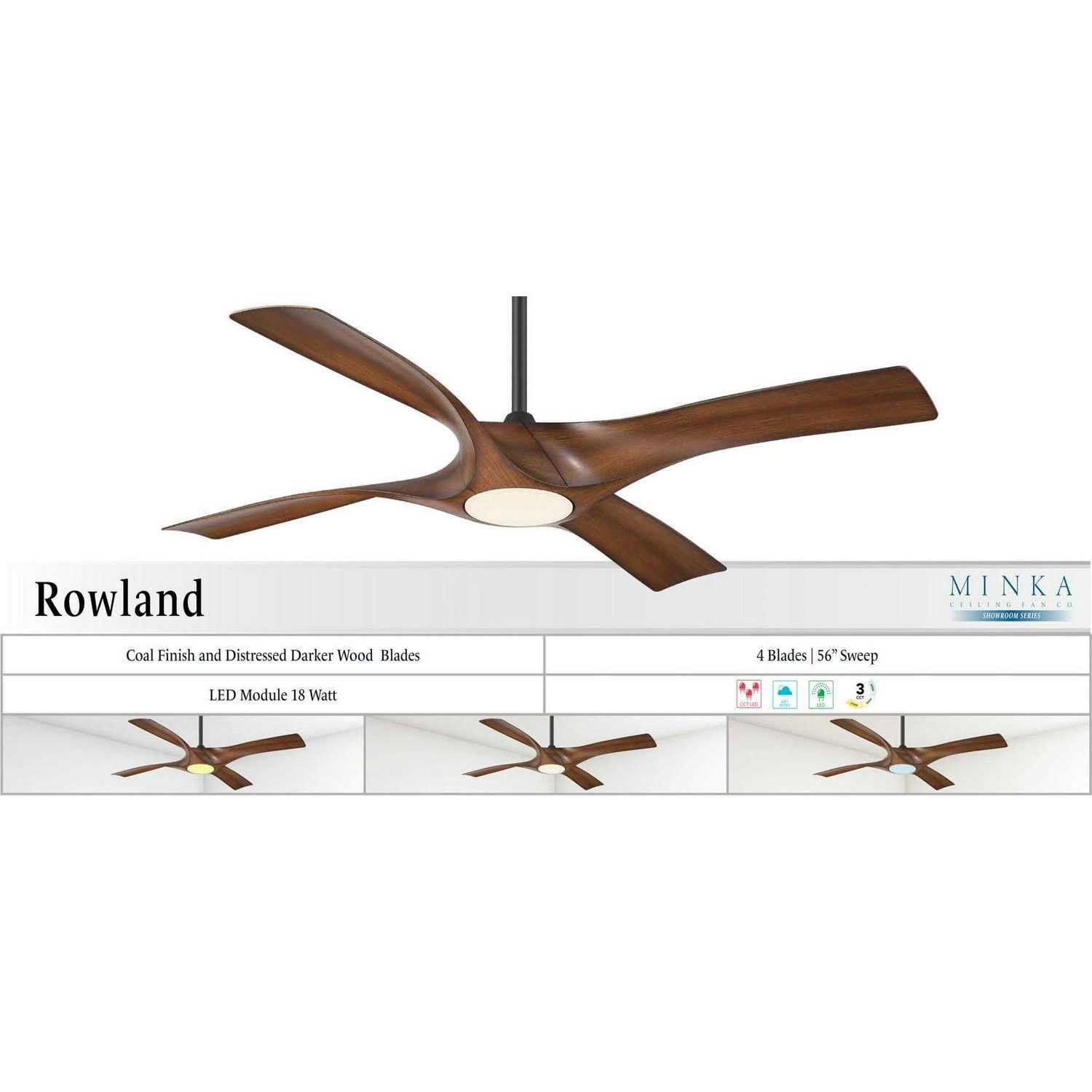 Sleek, simple and amazing. The Rowland Collection by Minka Ceiling Fan Co, the new CCT LED Ceiling Fan in Matte Black Finish comes ready to serve all of your indoor and outdoor cooling needs. With a swift 56 inch blade sweep, this Ceiling Fan quietly circulates four Distressed Koa finish blades with seamless fluidity. The fan is equipped with CCT LED technology for additional luminance with energy and cost-saving value. The Rowland Collection by Minka Ceiling Fan, takes ceiling fans to the next level of cutting-edge technology Minka Ceiling Fan Co.