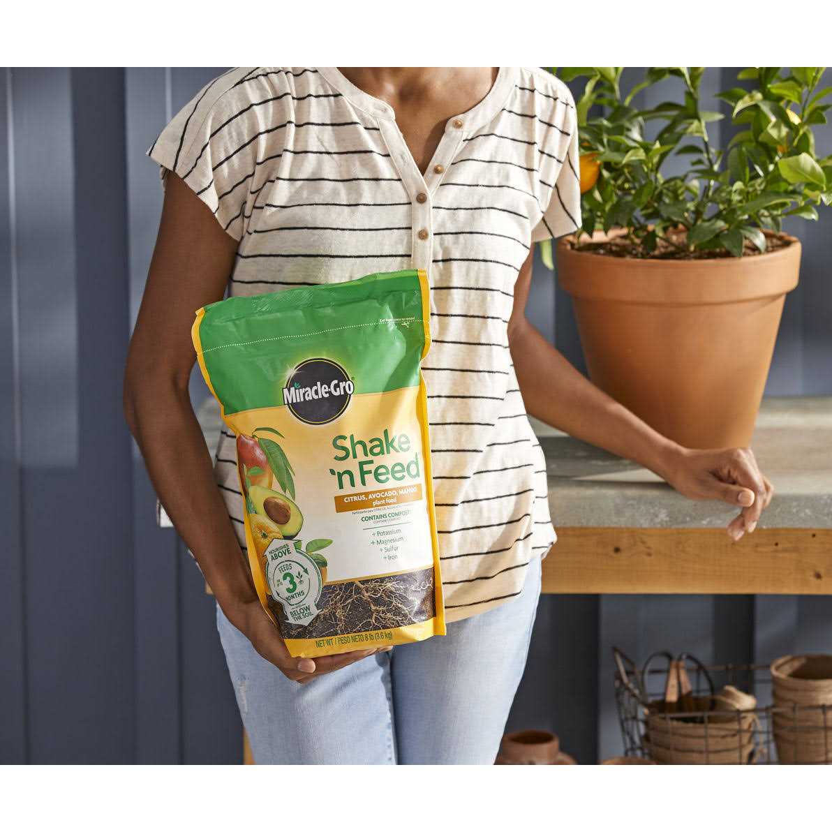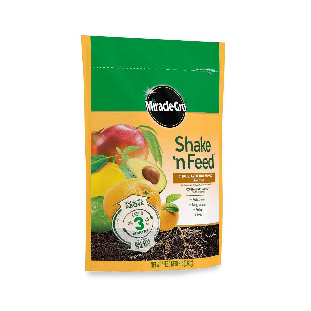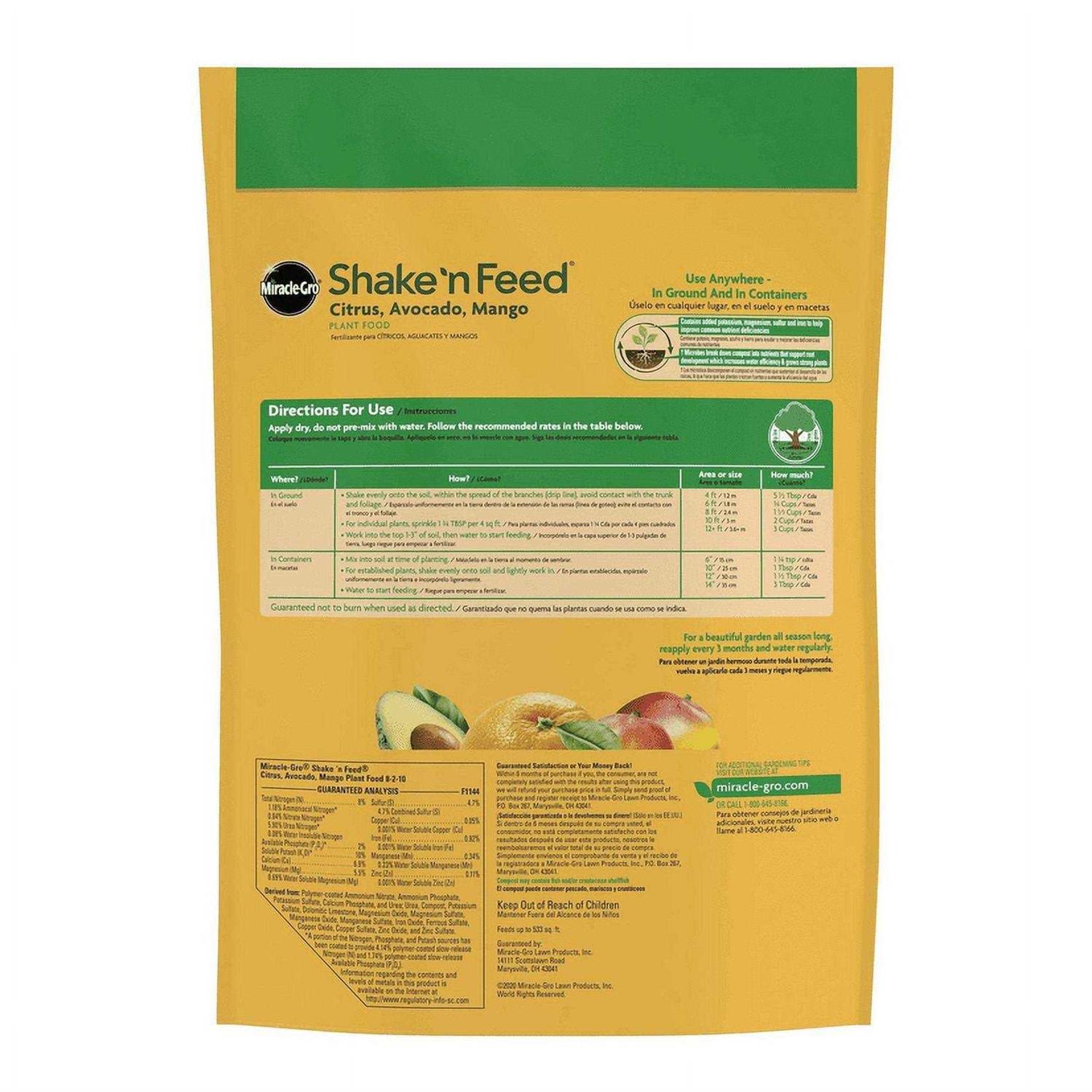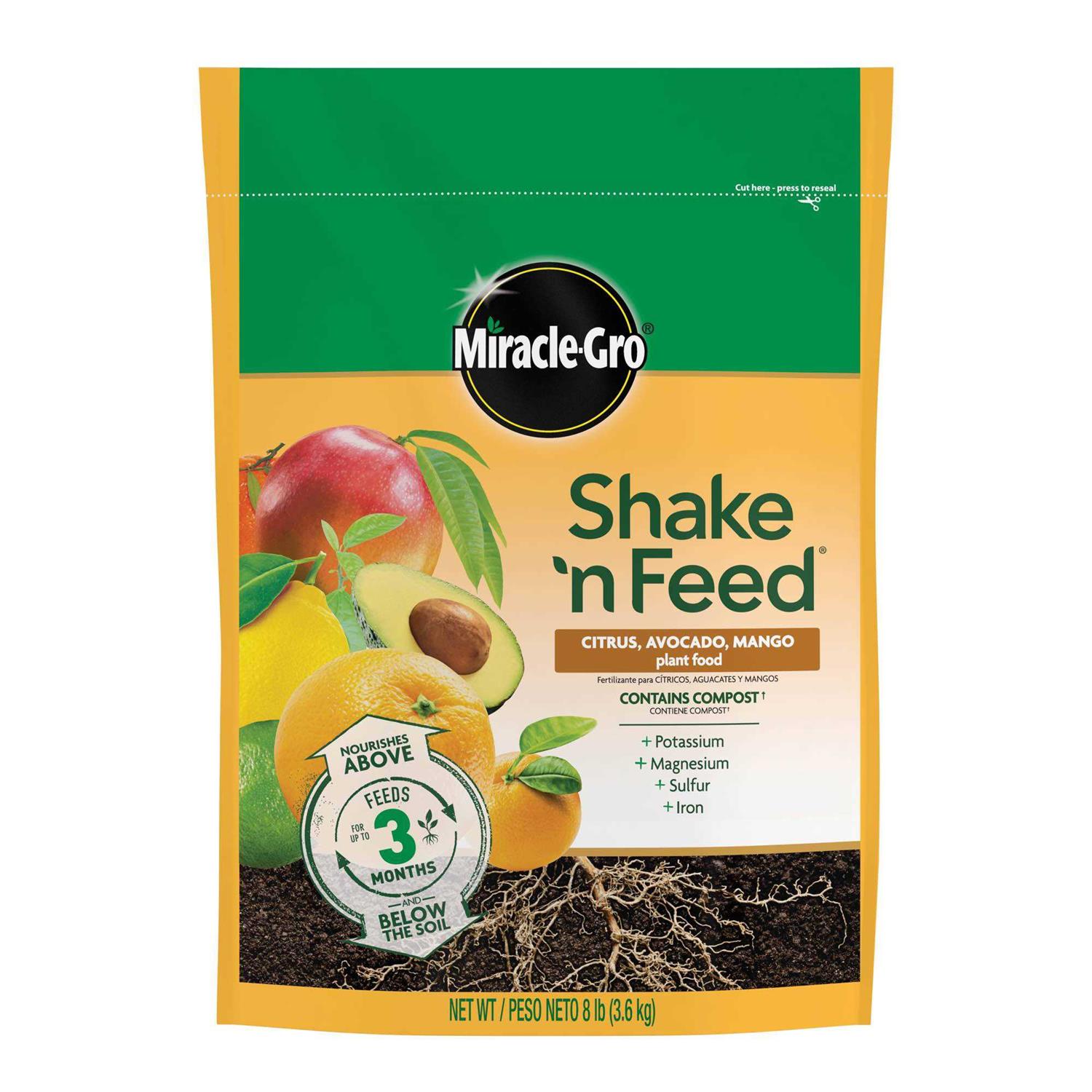 Fertilizers & Plant Food by Miracle-Gro. Details:Miracle-Gro Shake n Feed Citrus, Avocado, Mango Plant Food contains added potassium, magnesium, sulfur and iron to help improve common nutrient deficiencies. Microbes break down the compost into nutrients that support root strength and development which increases water efficiency and grows strong plants. You can use it anywhere: in ground and in containers for feeding up to 3 months. Feed your plants with the help of Miracle-Gro Shake ‘n Feed Citrus, Avocado, Mango Plant Food.