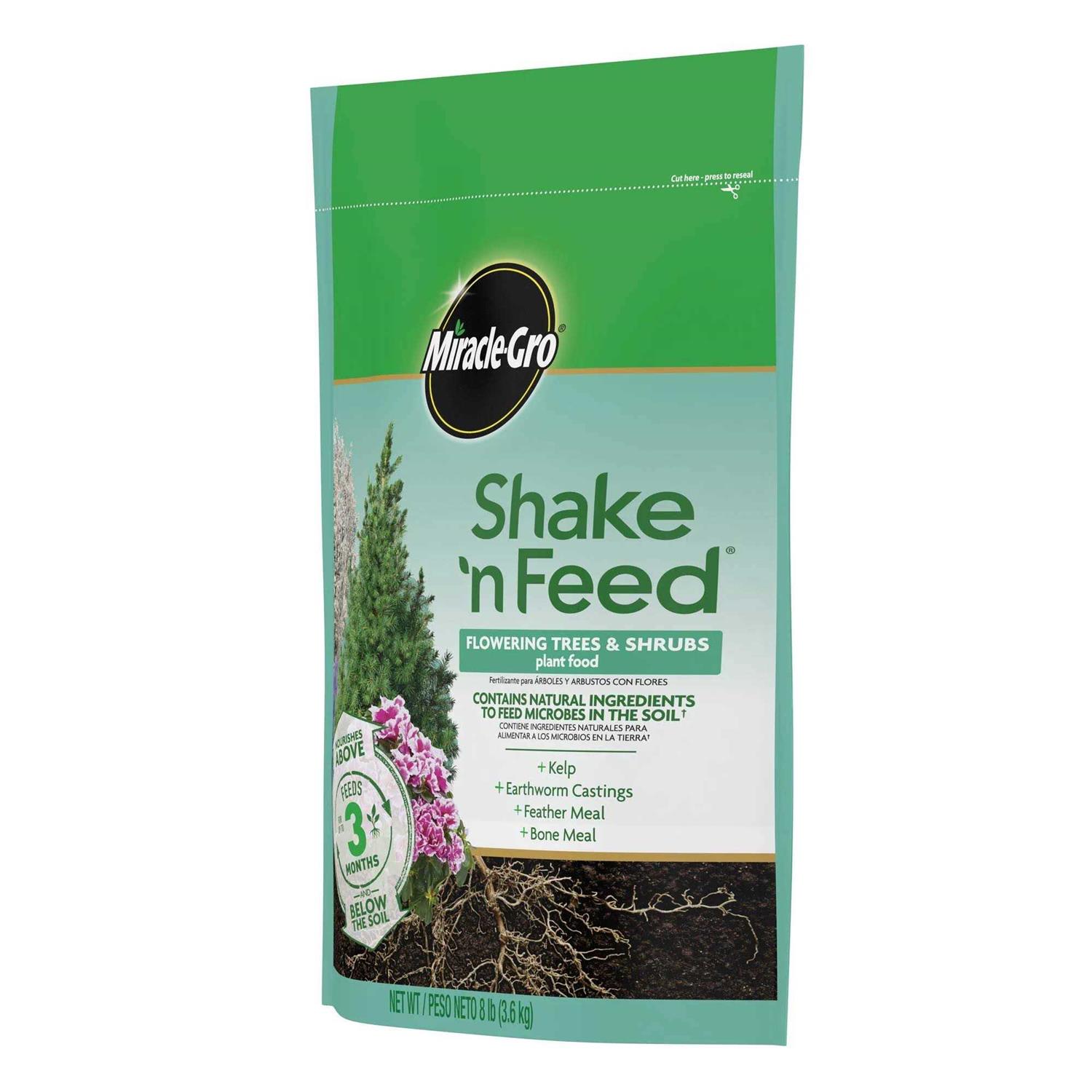 Miracle-Gro Shake n Feed Flowering Trees & Shrubs Plant Food contains vital micronutrients, plus added natural ingredients, to nourish above and below the soil. It has been formulated with kelp, earthworm castings, feather meal and bone meal in an all-in-one particle to feed microbes in the soil. Microbes break down organic matter into nutrients that support root strength and development which increase water efficiency. Specifically designed for flowing trees, shrubs and other acid-loving plants to maintain deep, lush green foliage and colorful blooms throughout the season. You can use it anywhere: in ground and in containers. You can feed your plants for up to 3-months with the help of Miracle-Gro Shake n Feed Flowering Trees & Shrubs Plant Food.
