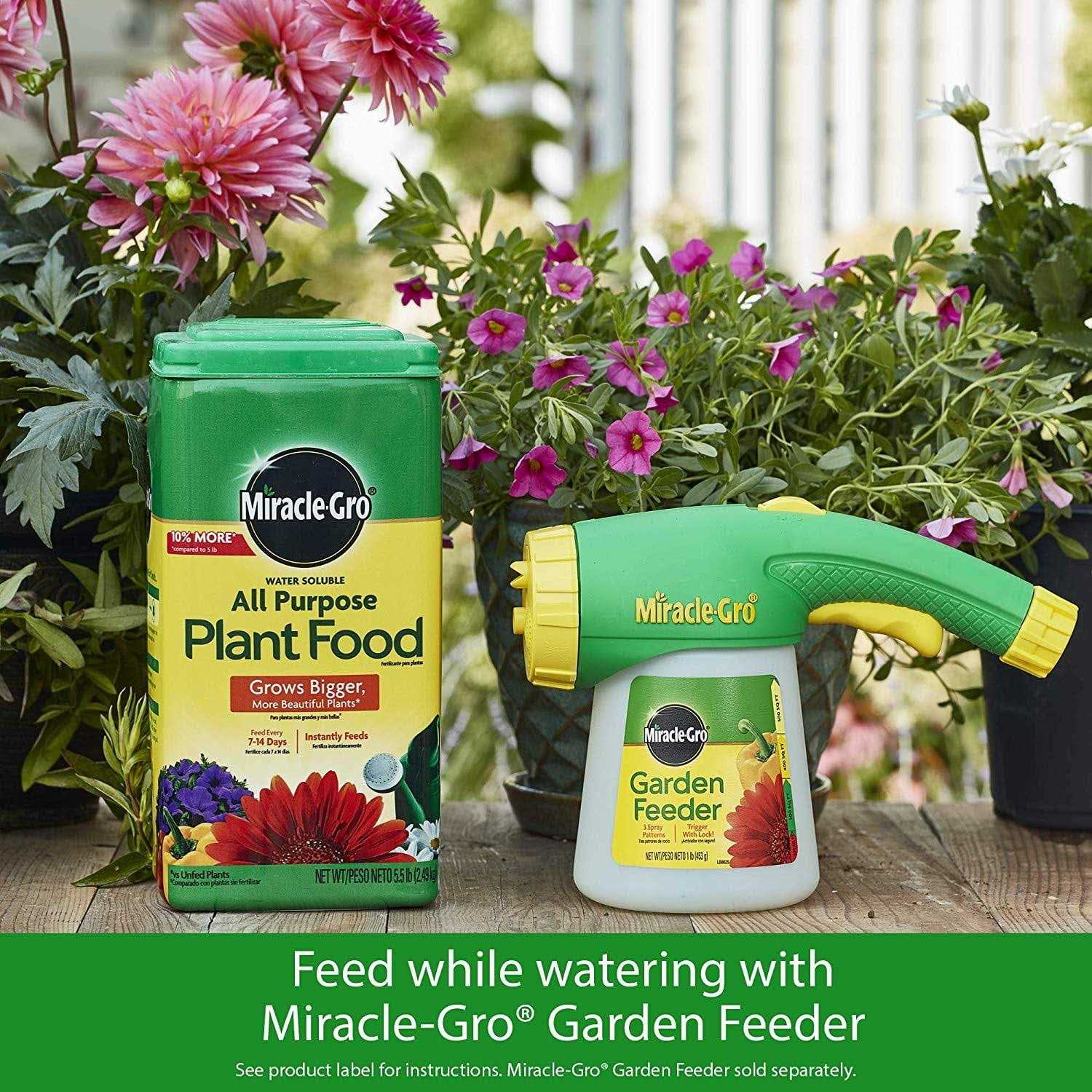 Miracle-Gro Water Soluble All Purpose Plant Food instantly feeds vegetables, trees, shrubs, and houseplants to grow bigger and more beautiful than unfed plants. Simply feed them every 1-2 weeks. The formula is safe for all plants, and is guaranteed not to burn when used as directed. Get beautiful results with Miracle-Gro.