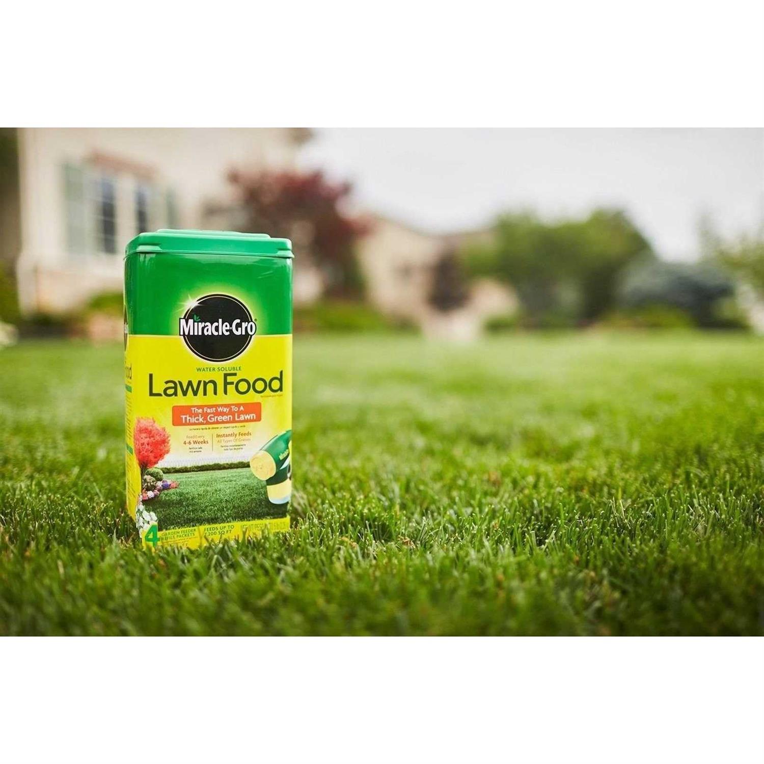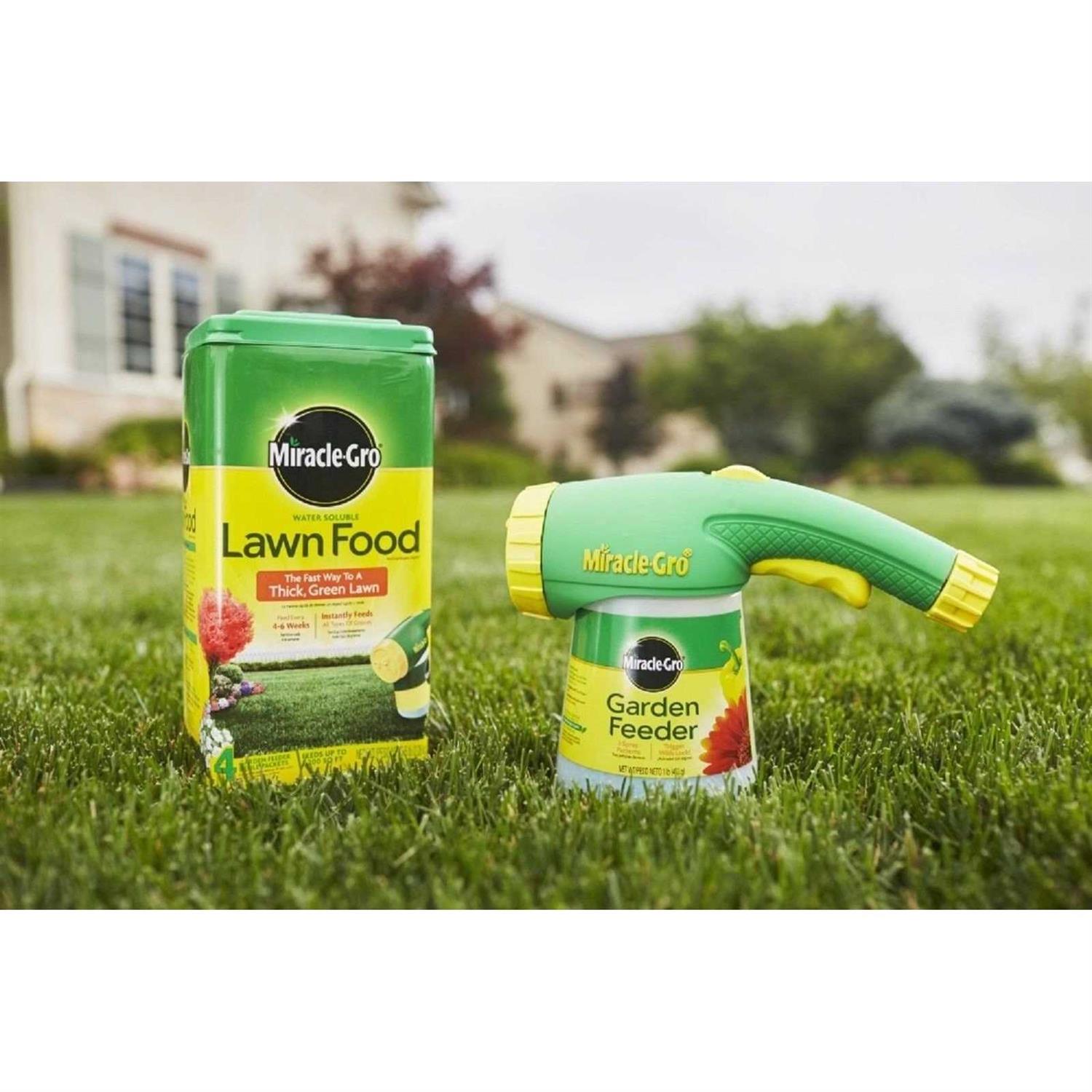 Miracle-Gro Water Soluble Lawn Food is the fast way to a thick green lawn. Use with the Miracle-Gro Garden Feeder to feed up to 7 200 sq. ft. on all grass types. With Miracle-Gro your grass can be the pride of the neighborhood.