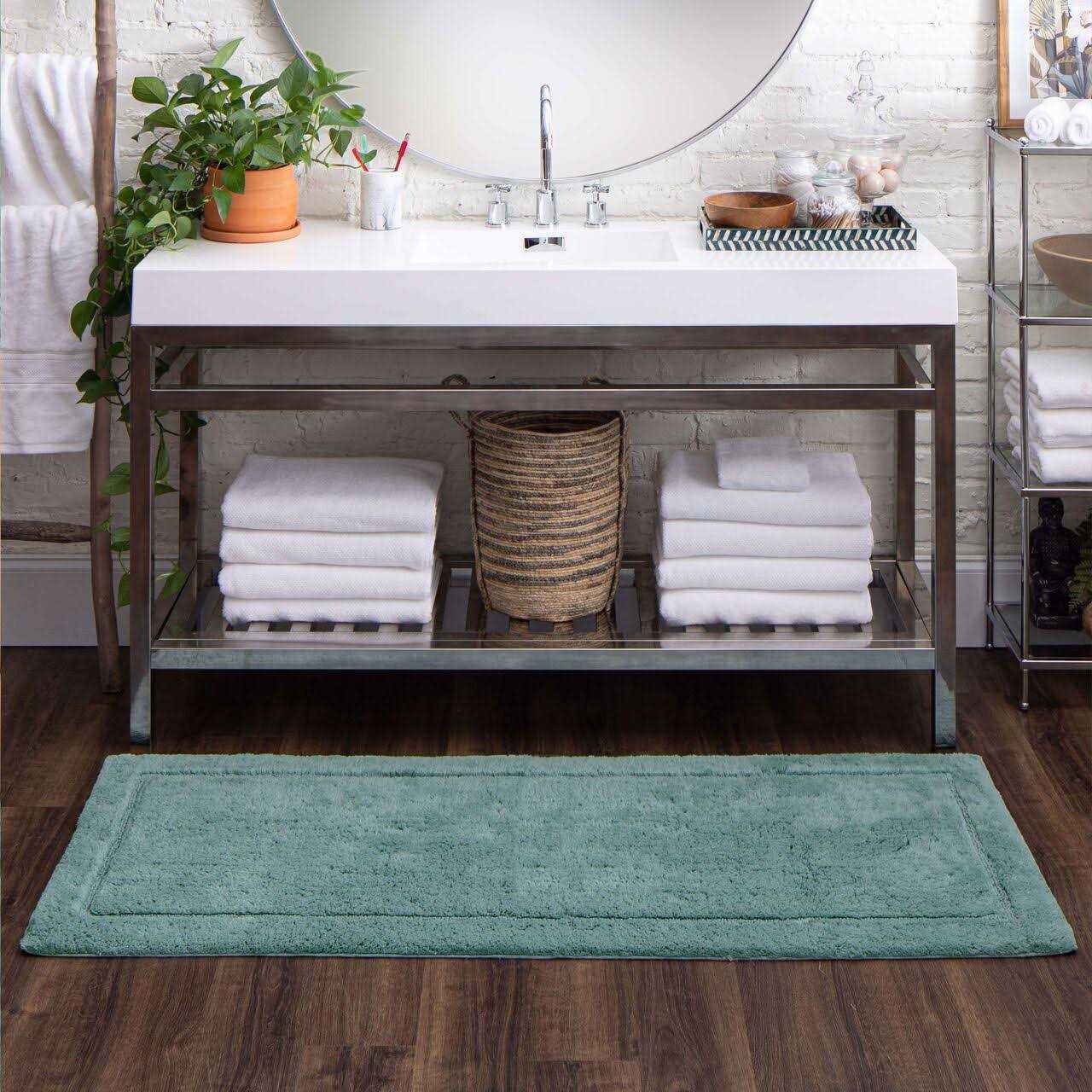 Premium cotton yarns of this bath rug are double combed to eliminate loose fibers, creating a lovely low-linting pile. The subtle luster and superior quality of our rug is drawn from the special spinning process called “ring” spinning that is utilized in the creation of this design. The densely packed cut pile is inlaid with a subtle looped pile, adding superior long-lasting attributes to the classic design. Color: Glacier.