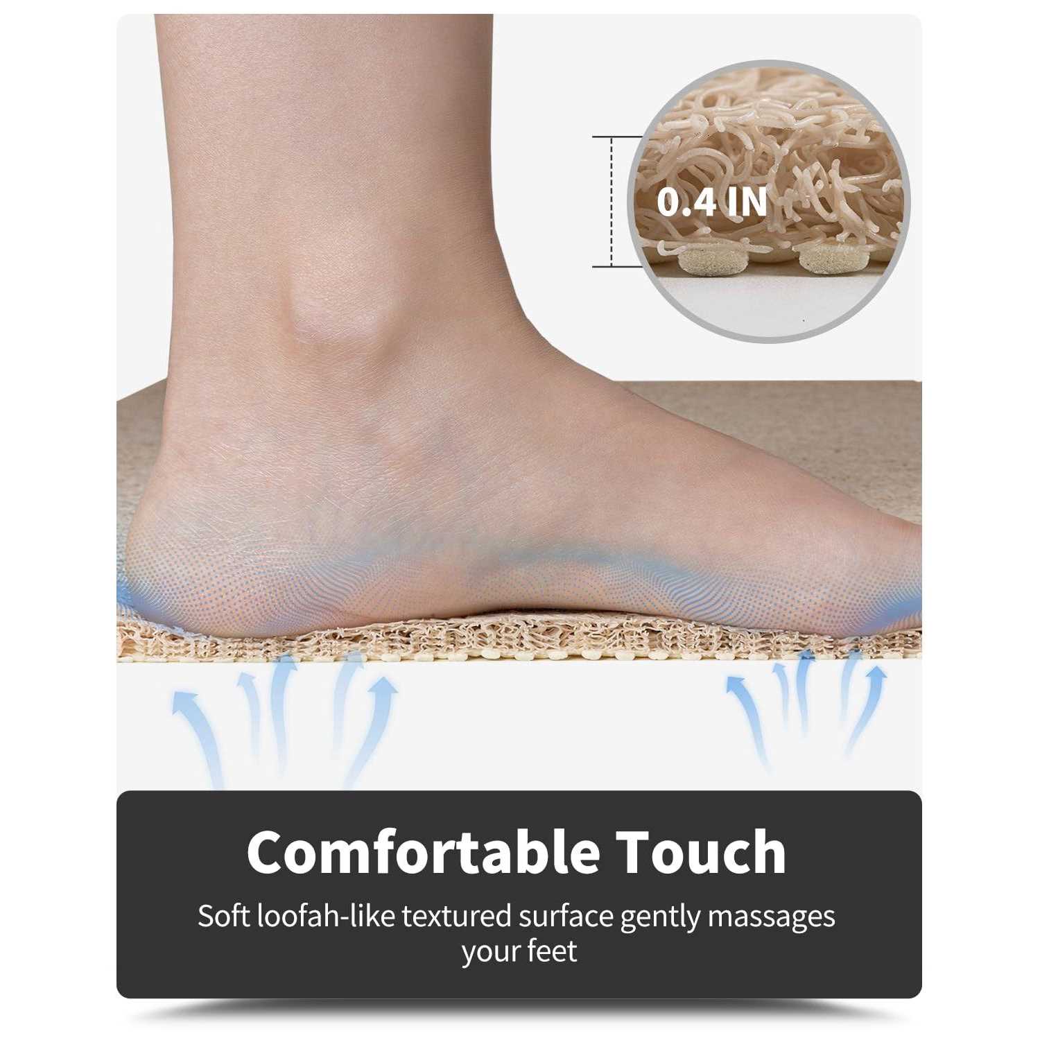 Non Slip & Durable: Instead of traditional bath mats with difficult cleaning suction cups, which may slide around and damage your tub or floor surface, our bath rugs have more practical and durable plaid backings. The lattice patterns on its bottom can ensure the safety of your family by holding the mat steadily in place. Elderly people and children welcome. Comfort Shower: Soft loofah-like textured surface of ideal thickness makes this shower rug comfortable for your shower in bare feet. Besides cutting the cold hard floor off from your body and providing a warm support, it also gently massages and exfoliates your skin. Outstanding Draining: As natural drain holes, loop surface and lattice bottom can work together to encourage water to flow past the bath mat without getting caught. No need to worry about blocking water. Easy Cleaning: The foam on top can be easily rinsed off. You can simply use a showerhead and just leave the mat with lattice bottom up on your bathroom floor, or hang over your bathtub, your bath safety bar. The mat can dry fast, which creates no smell or marks on your floor. Safe To Use: Made from all premium recyclable materials, our odorless bath drying mat with nice neutral colors has more reliable quality. Phthalate Free. Safe and ideal for any use in your private home and public places, like restaurants, hospitals, nursing homes, schools, childcare facilities, etc. P /P P /P PVC high-quality bathtub mat. The non-slip mat is loop design so that water can pass through without remaining. Made of high-quality materials, soft, durable, and stable. A non-slip layer is added to the bottom of the shower mat, which is suitable for all places in the bathroom and also suitable for other wet surfaces.
