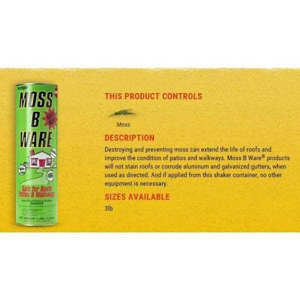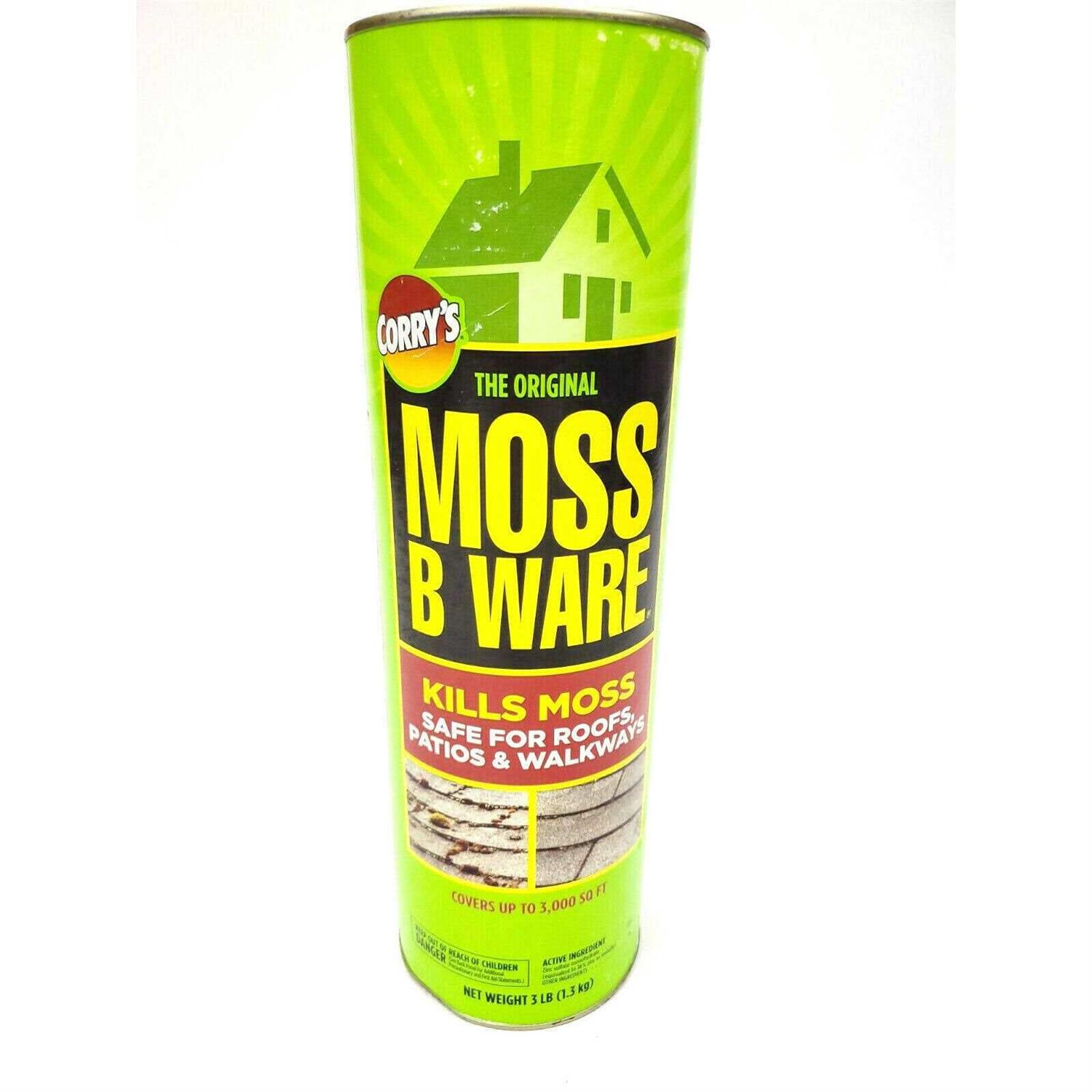 Shake Moss B Ware product directly from canister or dissolve in water for spray Moss B Ware controls moss on roofs, patios, decks, driveways, and walkways. Recommended for use on wood composition, concrete, or metal surfaces. 3 lb. canister treats 600 to 3000 sq. ft. Can be used in either dry powdered form or mix with water for liquid treatment. Active ingredient: Zinc Sulfate Mono Hydrate.