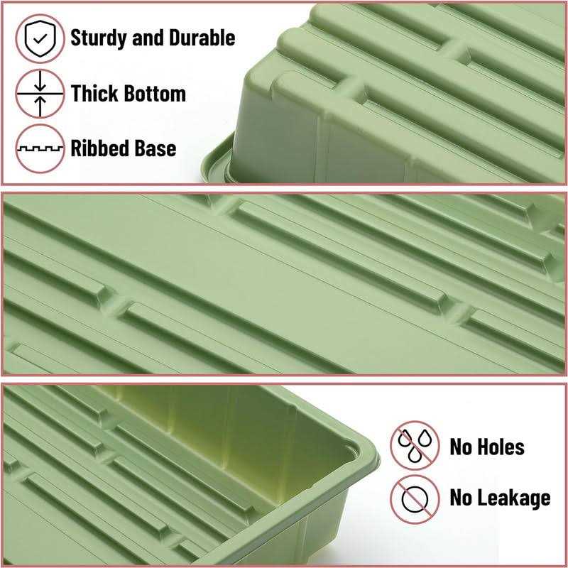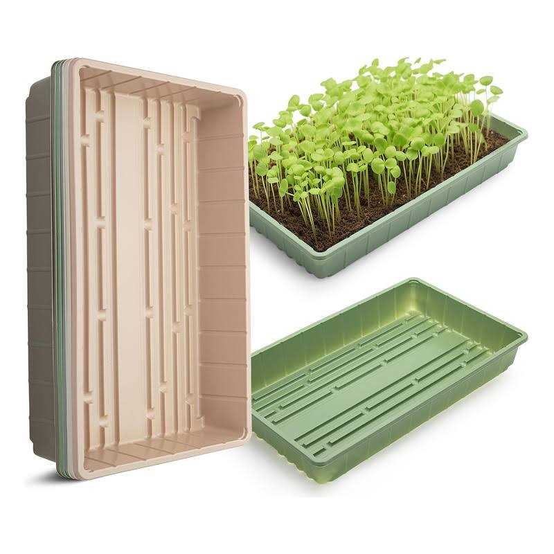 This package includes 5 seeding trays, making it easy for you to grow your own vegetables and flowers at home. Pen plant growing trays are made of sturdy, durable plastic and can be used repeatedly. Cut down on your costs and reduce waste by using our trays to grow plants indoors or out. Our seed trays effectively contain soil, fertilizer, and water, simplifying plant management. With a lightweight construction, our trays are easy to handle and maintain. Their dimensions measure 17 x 10 x 2.4 inches, providing ample space for your gardening needs. Pen plant growing trays are great for germinating seeds, growing sprouts and microgreens, or growing any plant. This tray will work with all heat mats, humidity domes, and hydroponics systems. These grow trays are perfect for potting, mixing soil, and growing plants! The one-piece design makes it easy to use and clean, and the raised edges keep your work area neat. Whether you’re a beginner gardener or a pro, this tray is a great addition to your gardening tools.