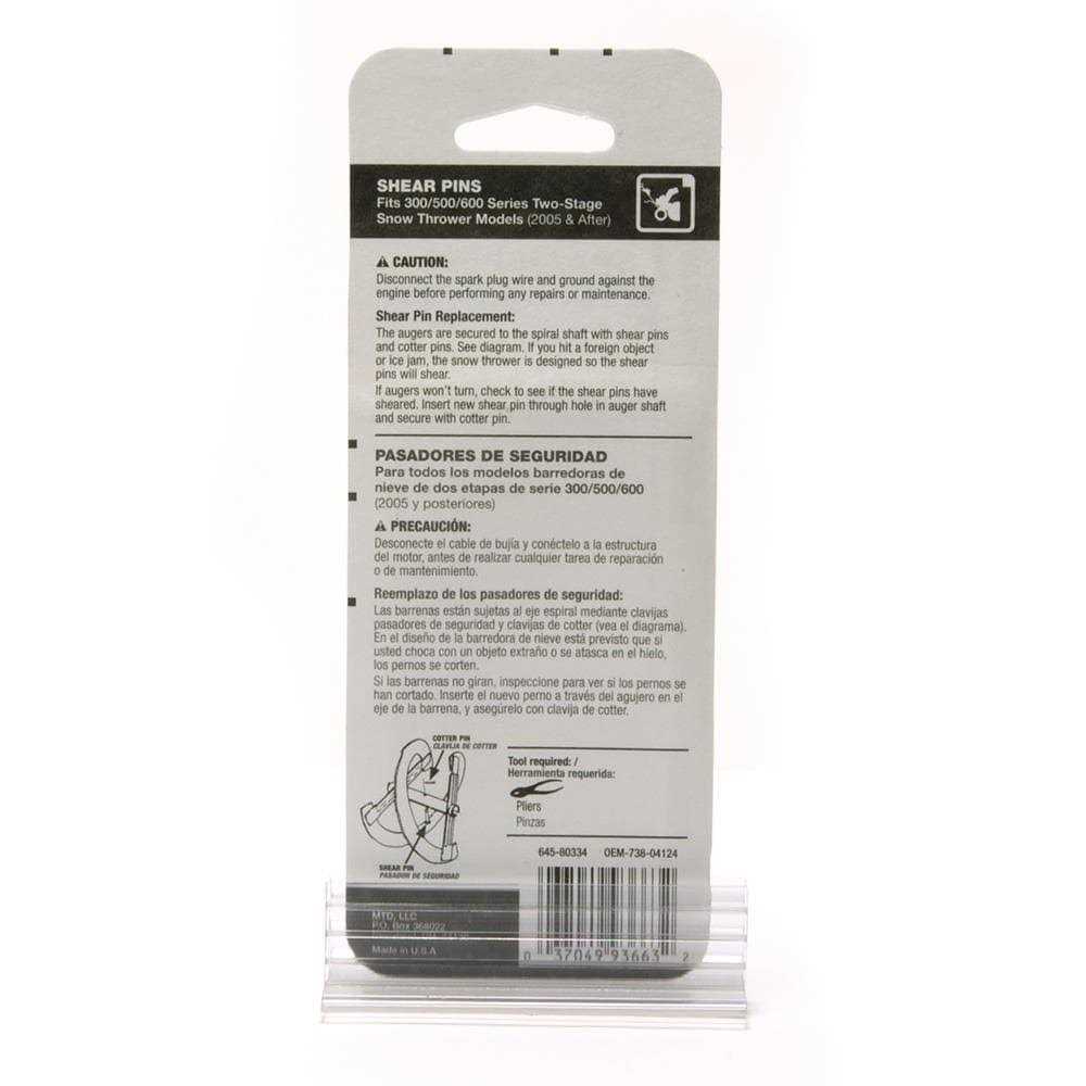 Shear pin kit OEM-738-04124 connects the auger to the rotating drive shaft. The shear pin is made of soft metal thatpurposely shears off or breaks to protect the transmission and motor if a foreign object or hard-packed snow bindsthe auger. The kit may include multiple parts; refer to your parts diagram for a complete list of parts included.