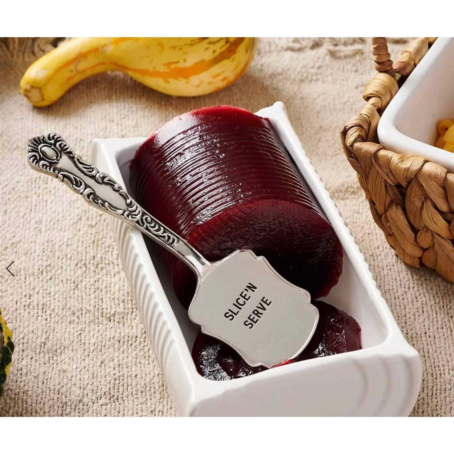 - Vintage style silver-plated spatula server is engraved and reads “slice n’ serve”.
