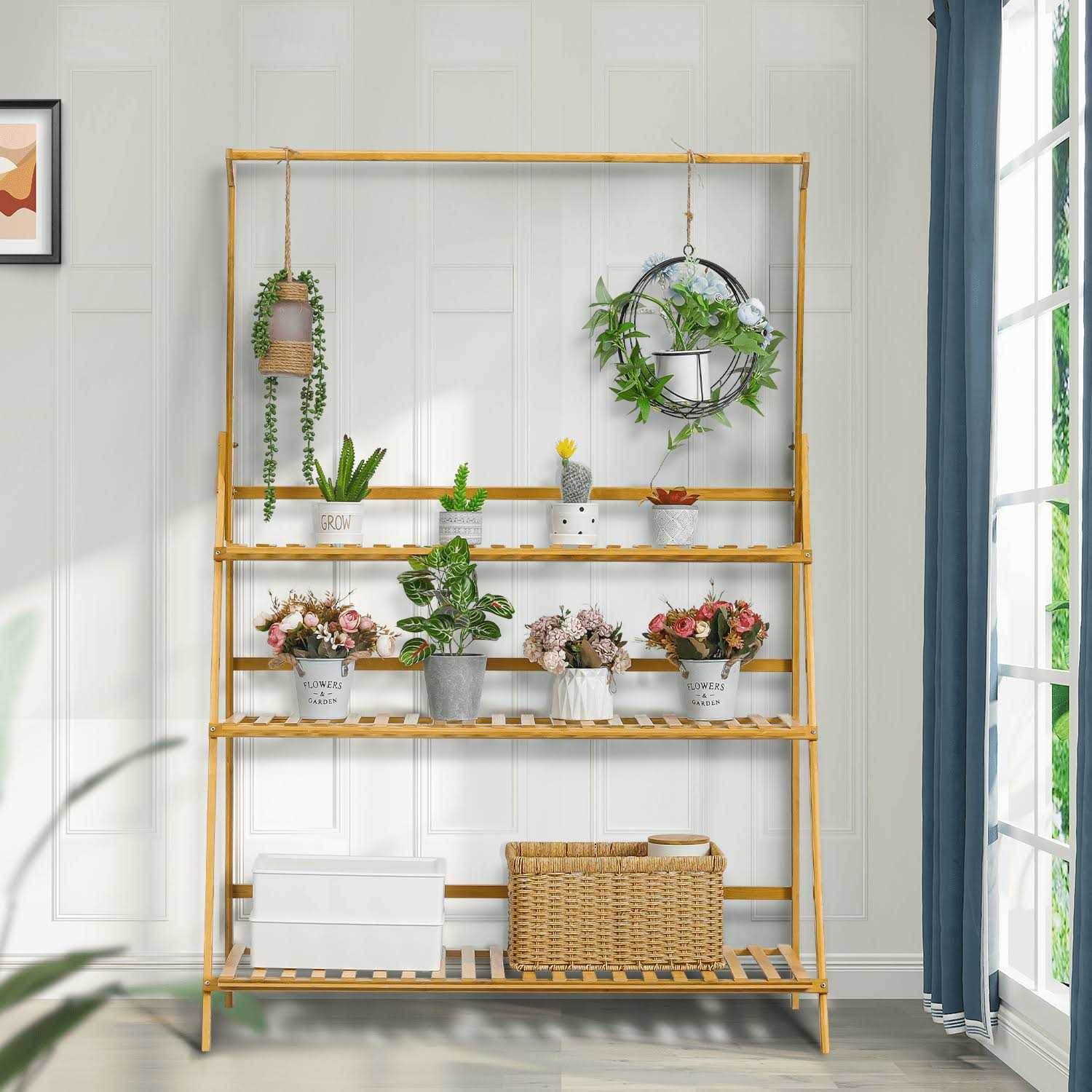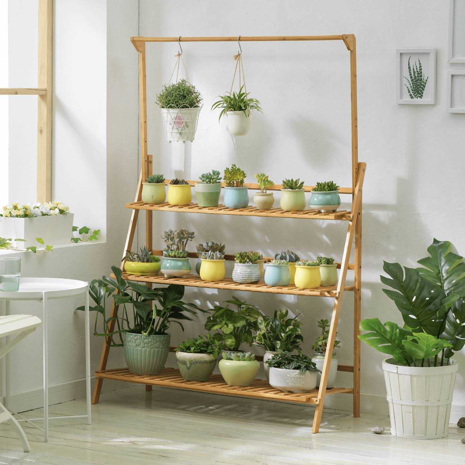 Multilayer Bamboo Wood Plant Stand Triangular Shelving With Hanging Basket MoNiBloom